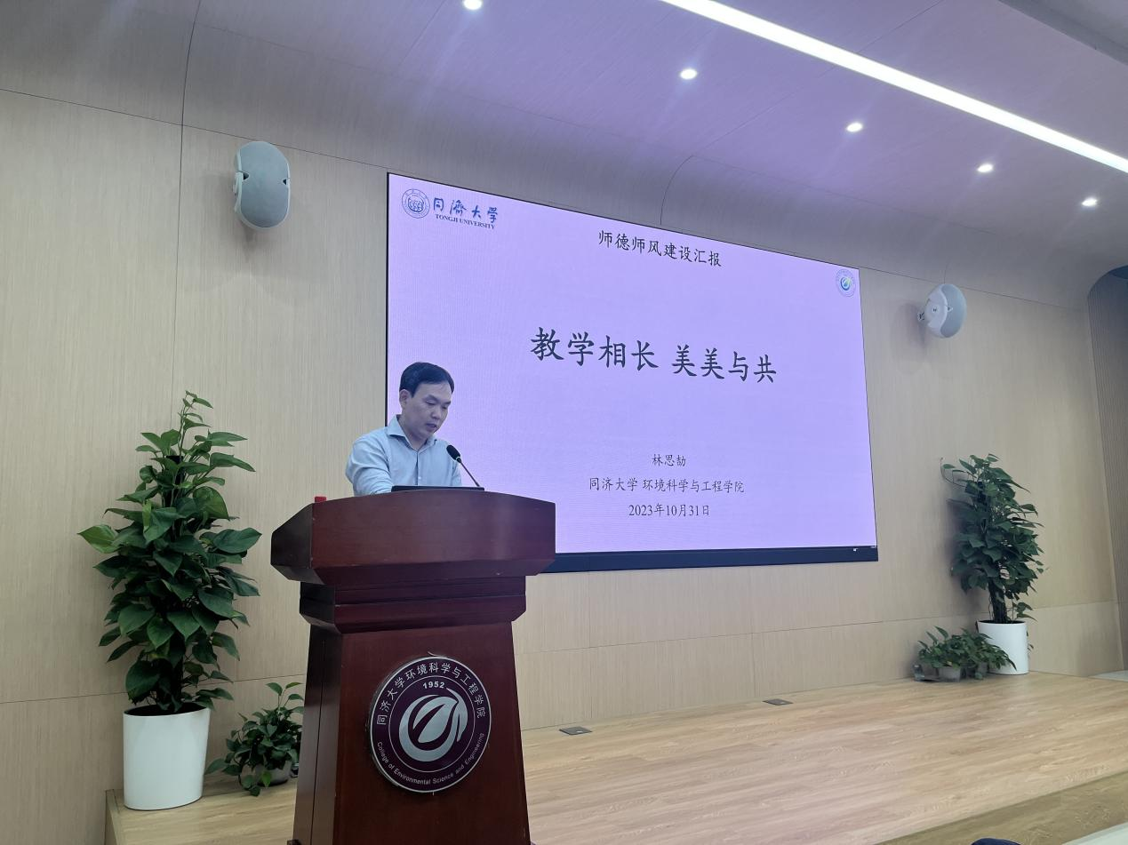 党的十八大以来,习近平总书记高度重视教师队伍建设工作,在不同场合多次强调教师工作的重要意义,对广大教师提出殷切期望,强调要做好老师、做“大先生”、大力弘扬教育家精神。2023年10月31日,环境科学与工程学院召开本年度第7次全院教职工政治理论学习大会,开展了“榜样在身边”宣传教育活动暨师德师风建设专题报告会。本次报告会邀请了2019年度“同济大学追求卓越服务奖”获得者朱志良教授、2023年度“同济大学师德师风优秀教师”获奖者林思劼教授分享工作经历和先进事迹,全院教职工参加了学习。报告会由学院党委副书记黄清辉主持。