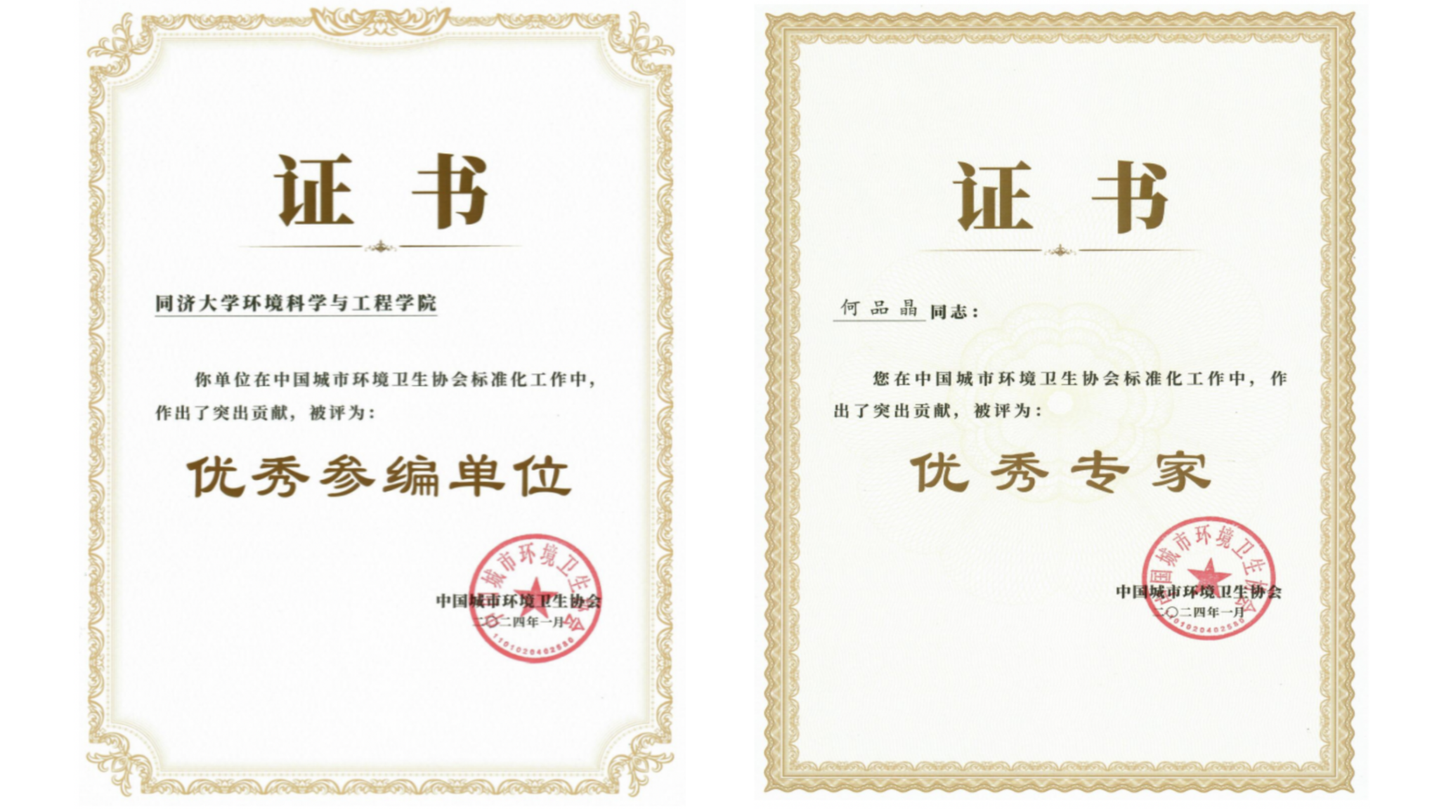 2024年1月11日,中国城市环境卫生协会标准化工作会议在北京举行,我院何品晶教授参加会议。协会充分肯定了何品晶教授团队过去几年在环境卫生标准化方面做的突出贡献,授予我院和何品晶教授优秀参编单位和优秀专家荣誉。