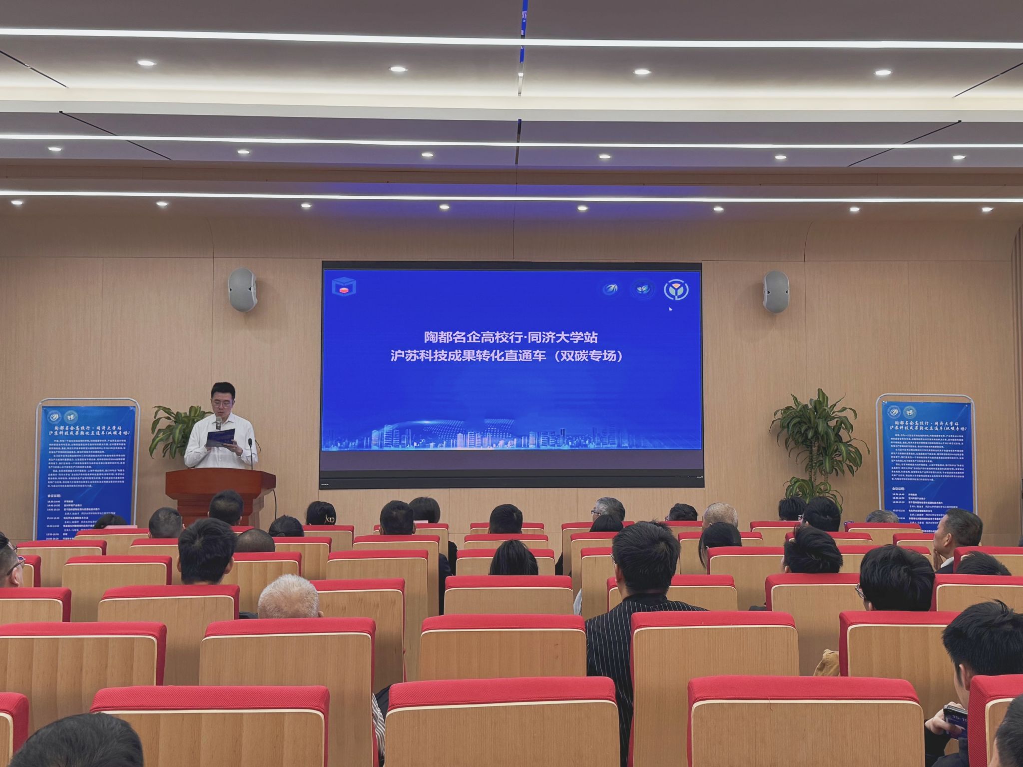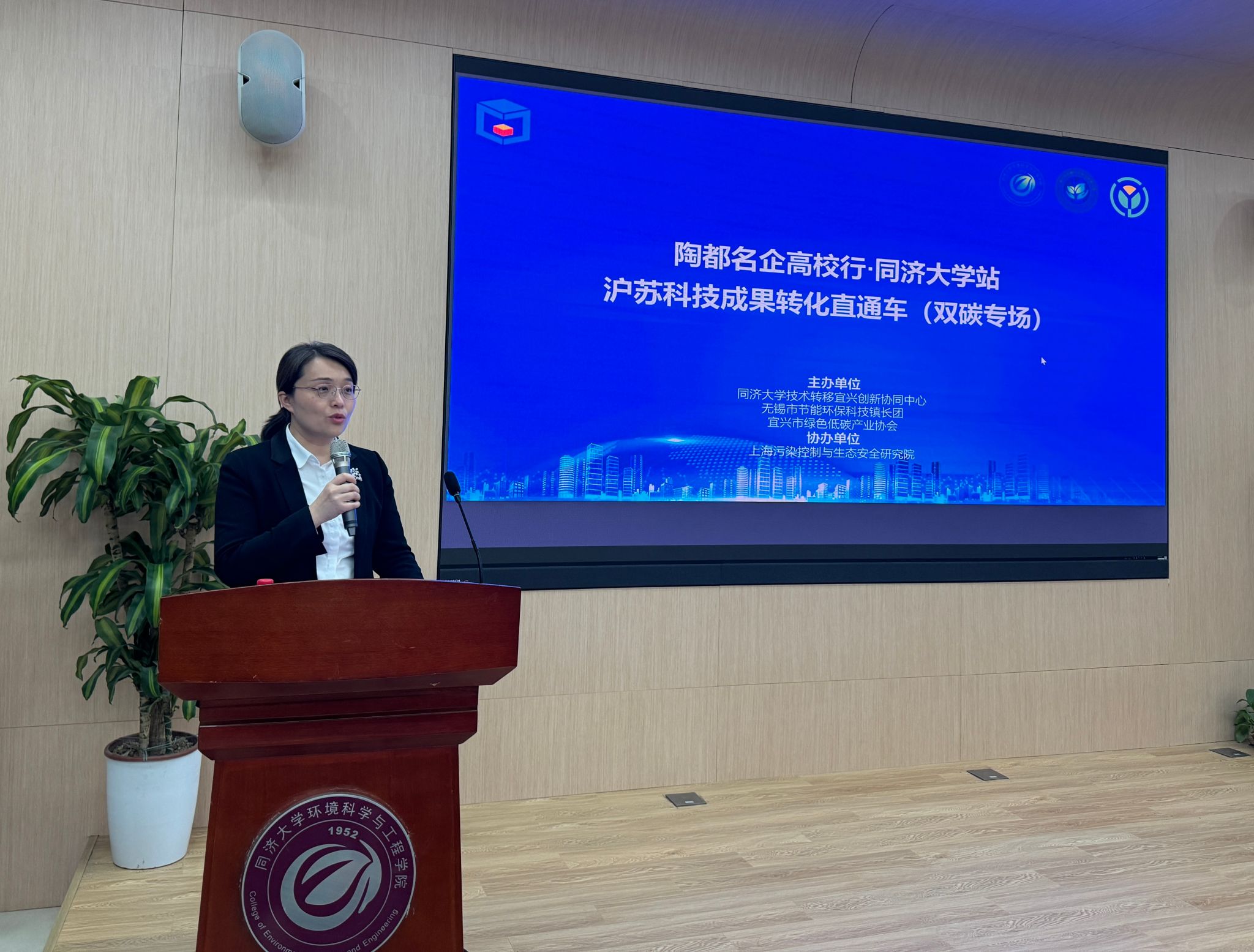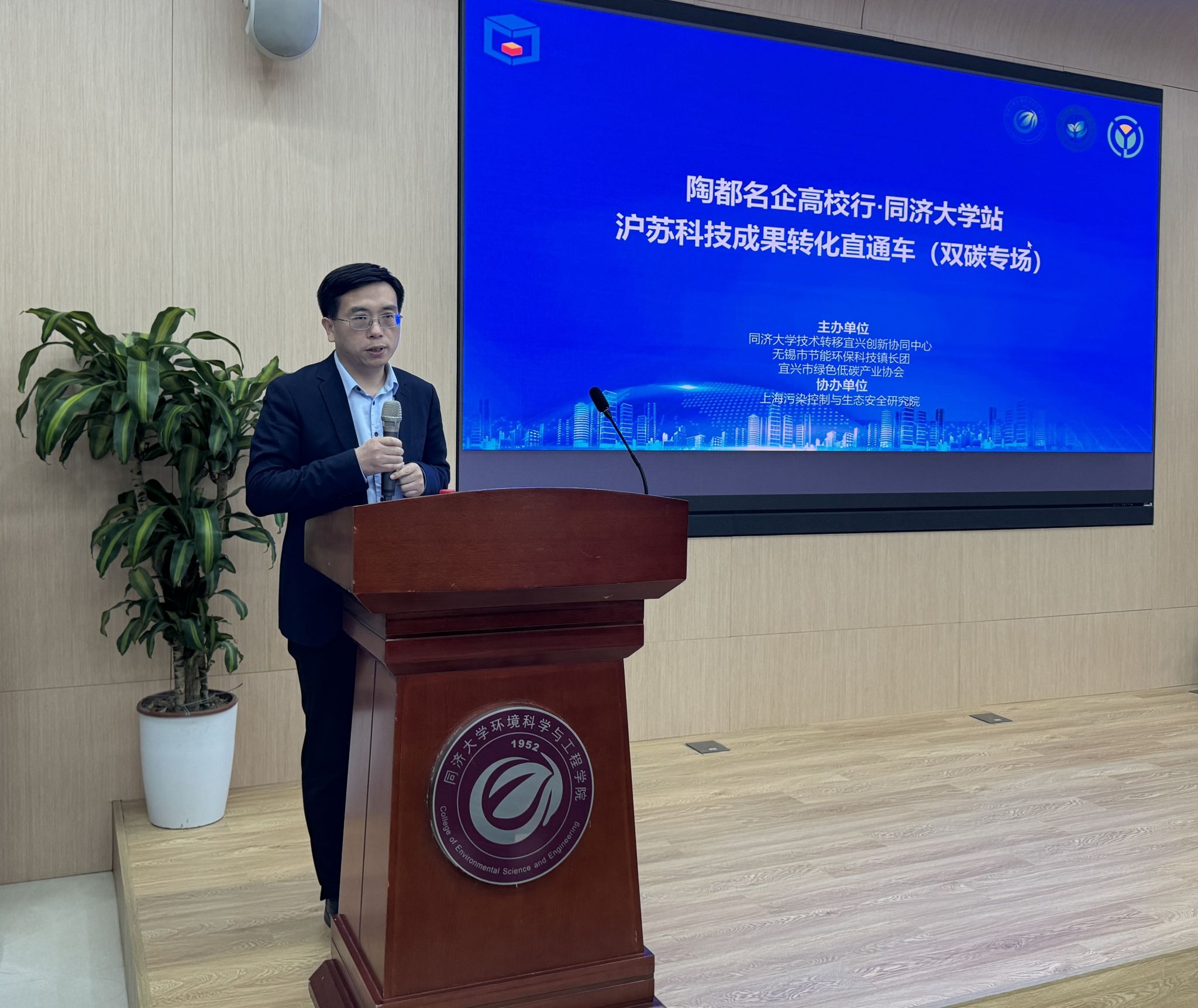 4月19日下午,“陶都名企高校行”·同济大学站暨沪苏科技成果转化直通车(双碳专场)在学院明净楼121报告厅顺利举办。本次活动由宜兴市科技局、同济大学环境科学与工程学院主办,无锡市节能环保科技镇长团、宜兴市绿色低碳产业协会、同济大学技术转移宜兴创新协同中心承办,上海污染控制与生态安全研究院协办。
