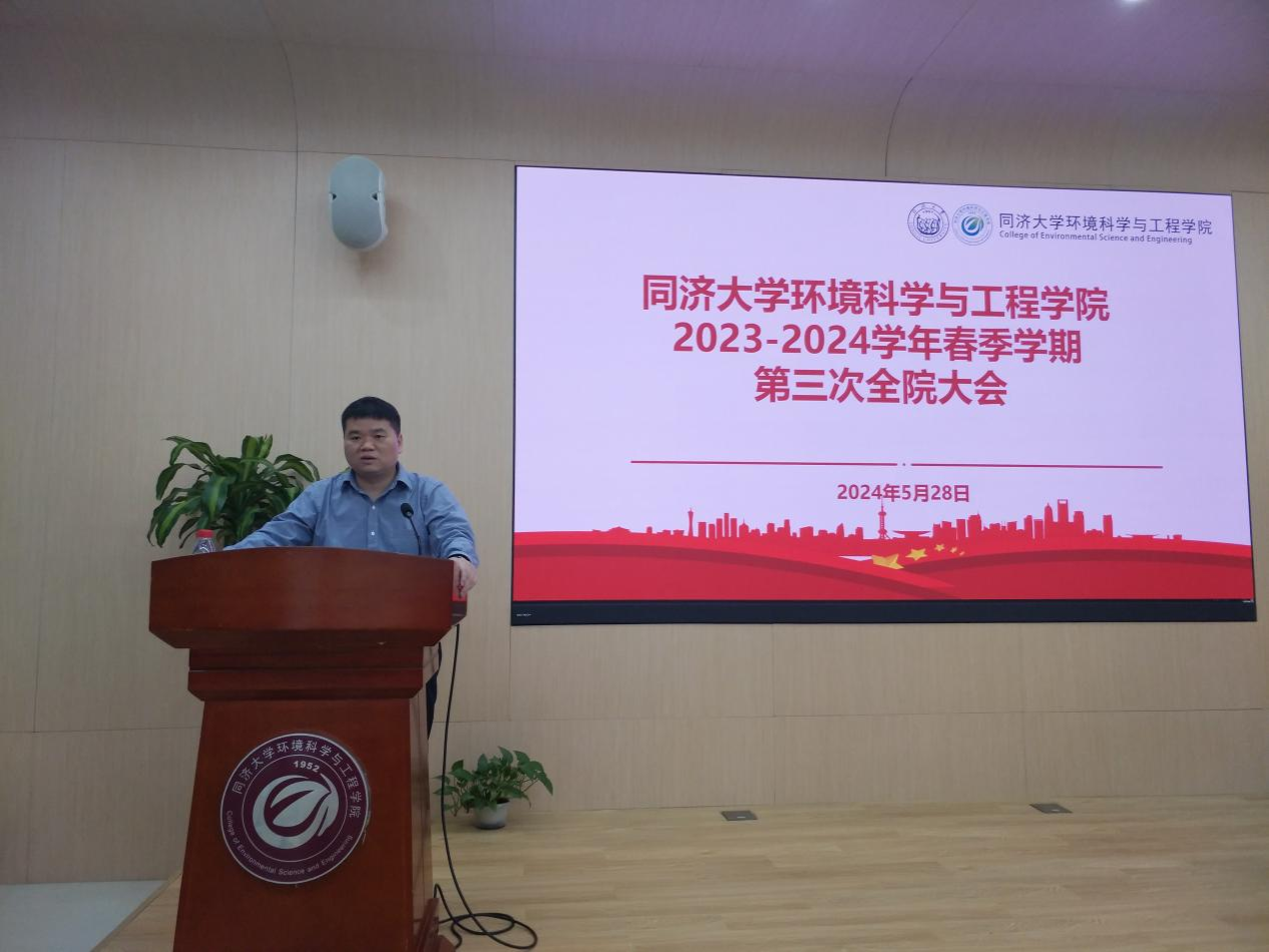 2024年5月28日下午13:30,环境科学与工程学院在明净楼121报告厅召开全院大会暨教职工政治理论学习会议。本次会议聚焦人才培养主题,分别由同济大学本科生院院长吴志军和学院党委副书记陆丽君做专题报告。学院党政班子及全体教职员工参加会议,会议由学院党委书记徐斌主持。