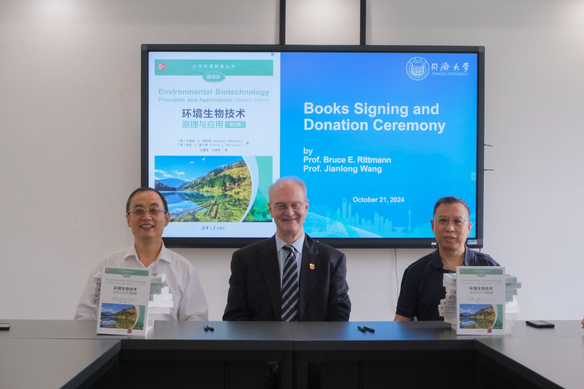 2024年10月21日下午,美国工程院院士Bruce E. Rittmann教授与清华大学王建龙教授在同济大学四平路校区明净楼向我院师生代表签名赠送了《环境生物技术:原理与应用》(第2版)中文版著作。夏四清教授对两位教授的到来表示欢迎和感谢,并介绍了课题组的基本情况。