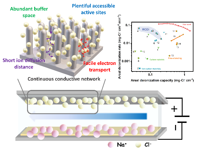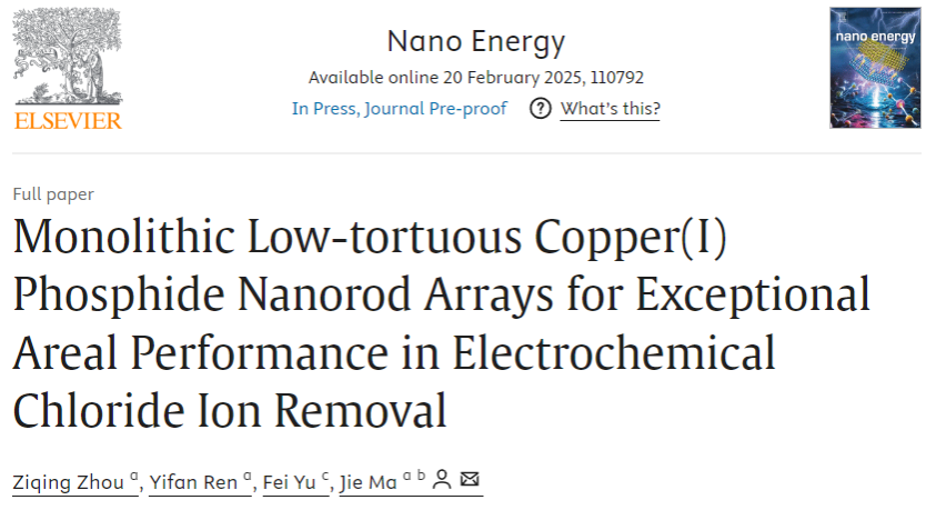 近日,我院马杰教授团队在工业废水电容去离子除氯方面取得进展,相关成果“Monolithic Low-tortuous Copper(I) Phosphide Nanorod Arrays for Exceptional Areal Performance in Electrochemical Chloride Ion Removal”发表在《纳米能源》(Nano Energy)上。