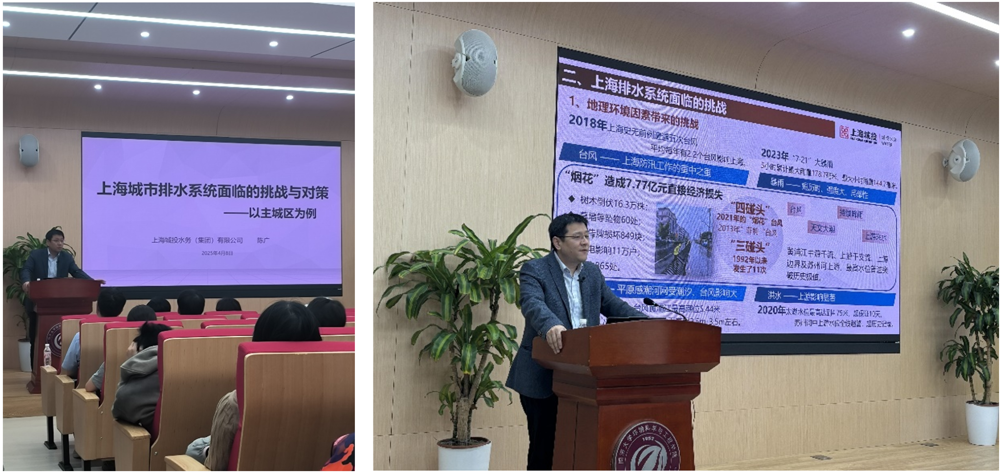 2025年4月8日,我院举办研究生高等讲堂讲座,特邀我院校友、现任上海城投水务集团副总经理、教授级高级工程师陈广博士作专题分享。在讲座中,陈广博士深入讲解了上海排水系统120余年发展历程与技术演进路径。他指出,城市治水应坚持“治污为本、截污为先、标本兼治”的总体原则,强化“绿、灰、蓝、管”的协同推进。陈广博士系统性分析了当前上海市排水系统面临的挑战,以及针对这些挑战所构建的创新多维防护体系,并介绍了上海还在不断探索的污水再生利用和污泥低碳化焚烧路径,推动排水系统向绿色高效转型。本次讲座由郑雄副院长主持,近90名师生参加。