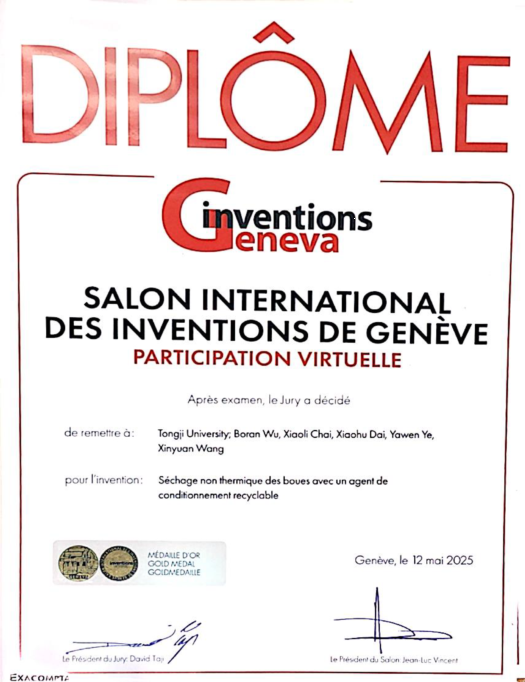 近日,第50届日内瓦国际发明展(The 50th International Exhibition of Inventions of Geneva)在瑞士日内瓦举办,我院武博然老师牵头的参展项目“调理剂循环利用的污泥非热干化技术(Non-thermal Drying of Sludge with Recyclable Conditioning Agent)”获得金奖。本项目提出通过水分原位结晶强化提高污泥脱水性能的新思路,利用水合物结晶反应的化学驱动力促使污泥中水分由固体间隙向均相晶体的定向迁移,在不改变水、固两相化学组成的条件下,将水-固浸润分布状态转变为水-固分相聚集状态,大幅提高污泥水-固分离性能,处理后污泥经板框压滤含水率即降低至40wt.%以下,且能实现气体调理剂的循环利用,脱水泥饼中无药剂残留,能耗仅为传统热干化技术的1/6。相关成果已申请和授权专利6件,其中包括美国发明专利1项,在Water Research等期刊发表多篇学术论文。同济大学为本项目唯一完成单位,完成人为武博然、柴晓利、戴晓虎、硕士研究生叶雅文、本科生王鑫源。