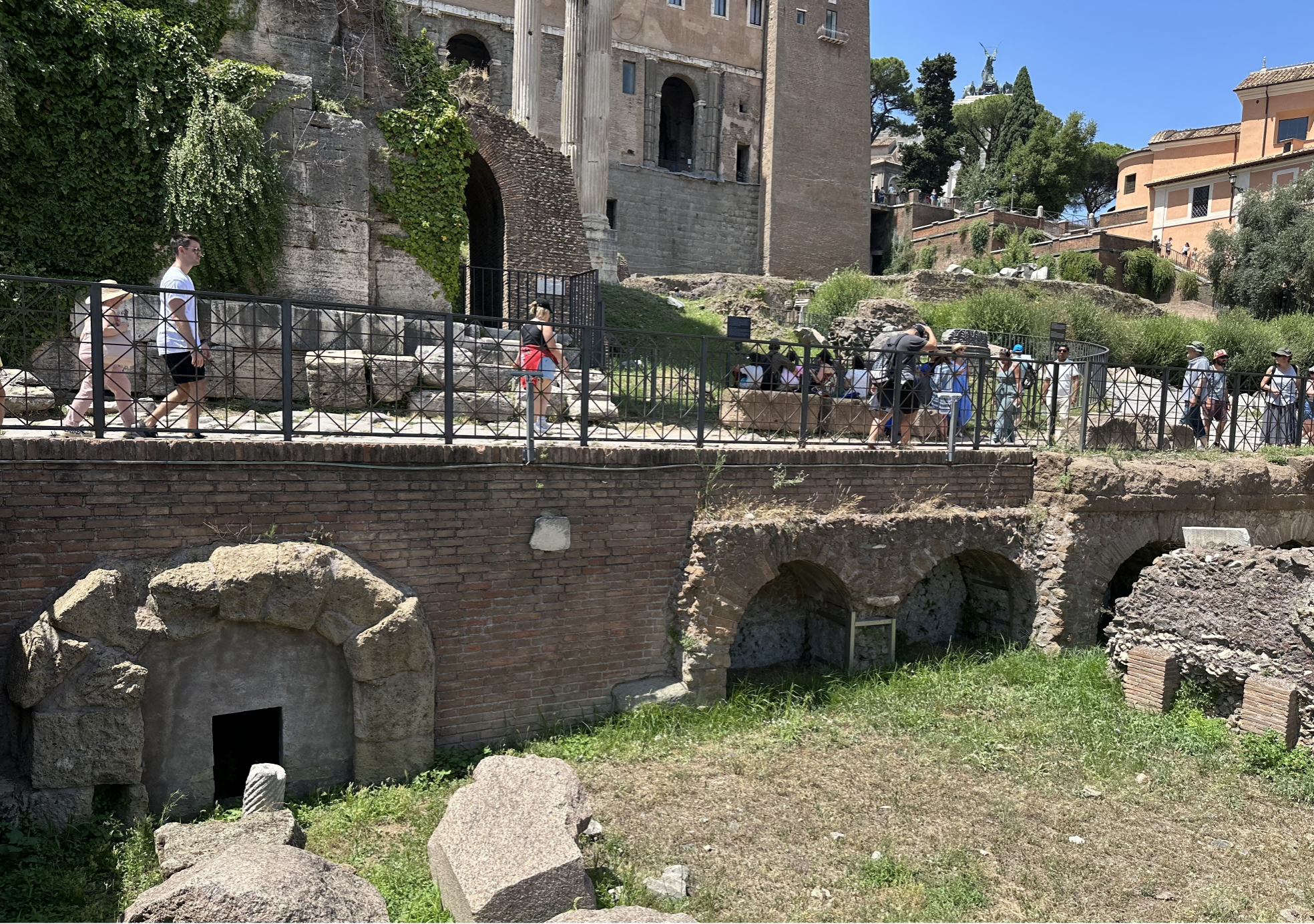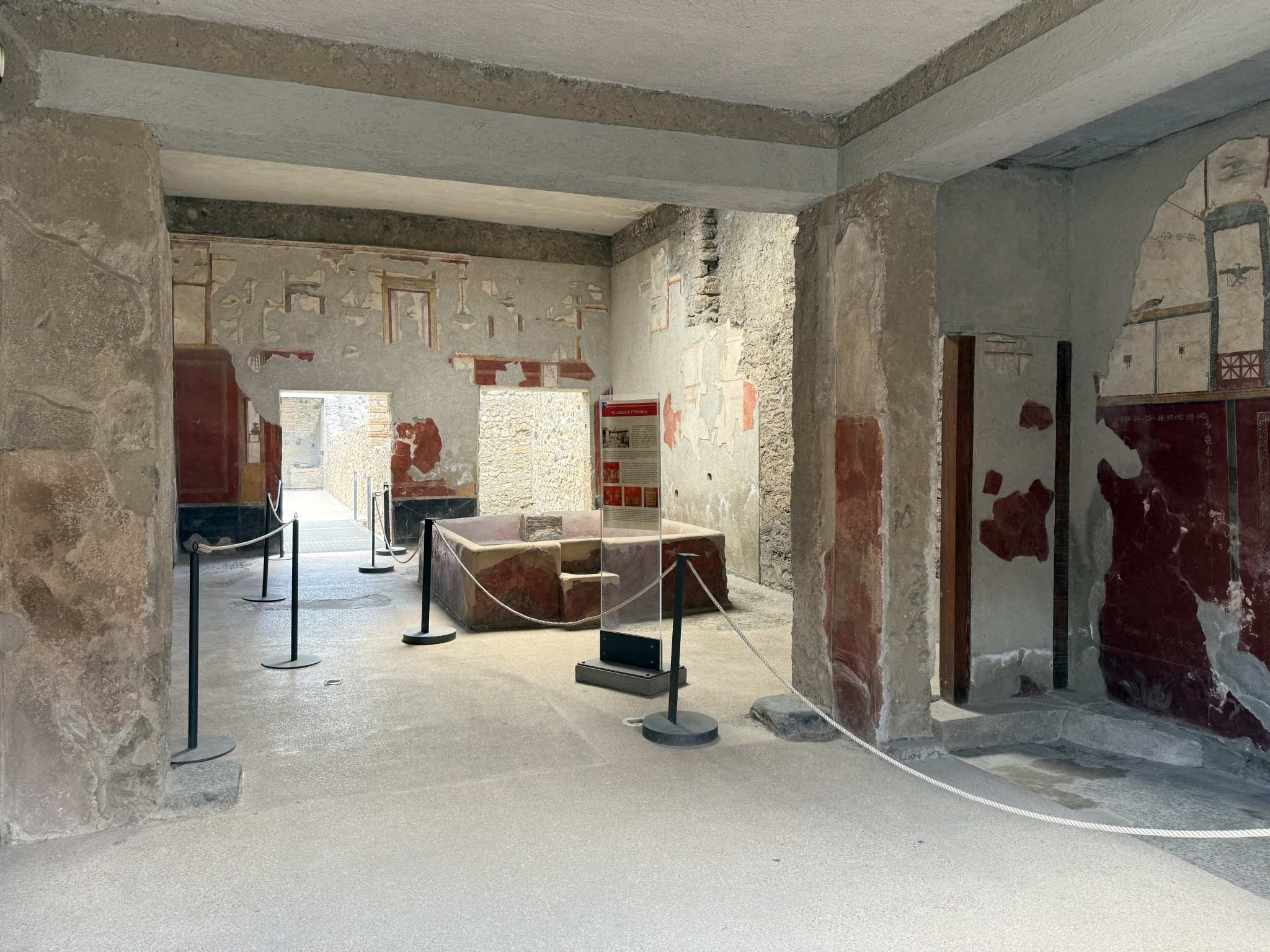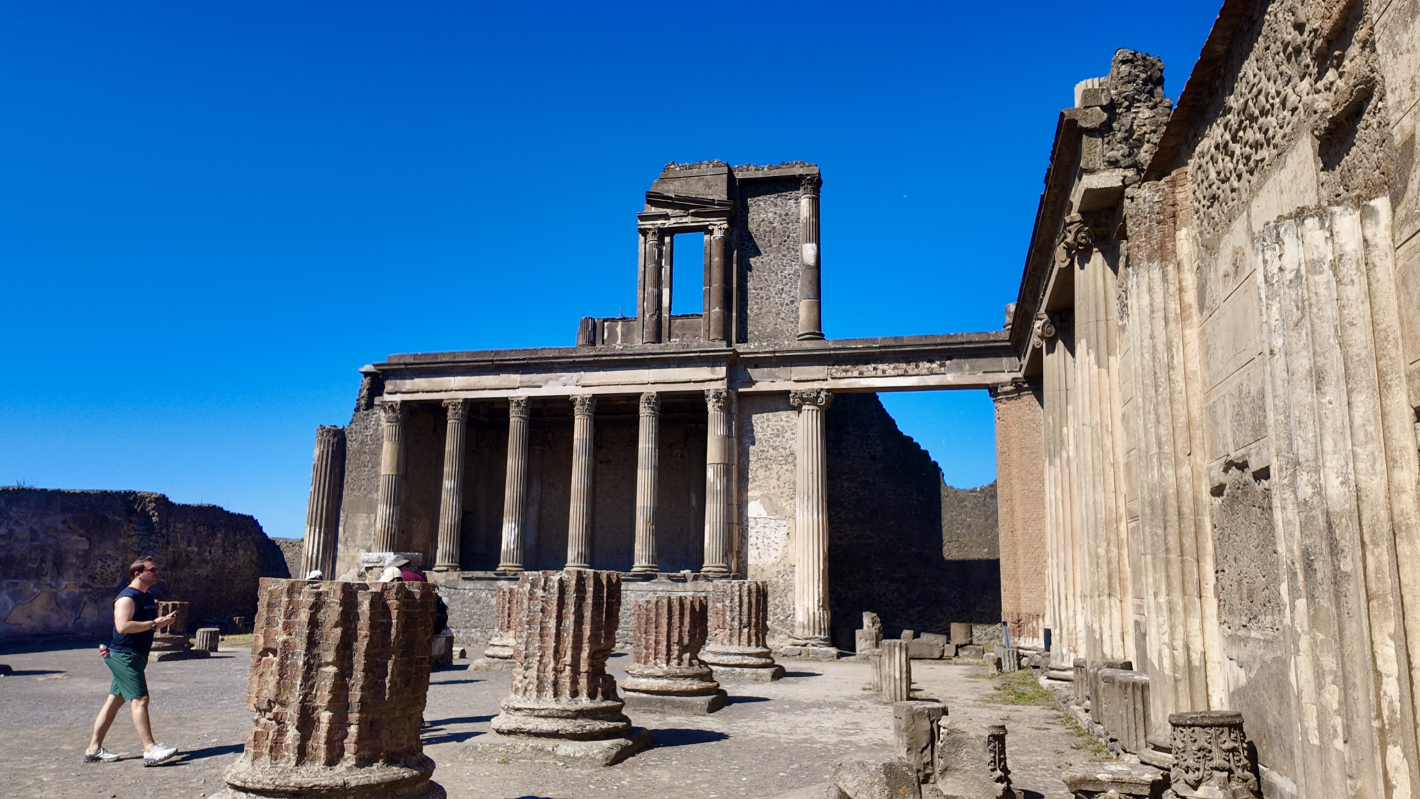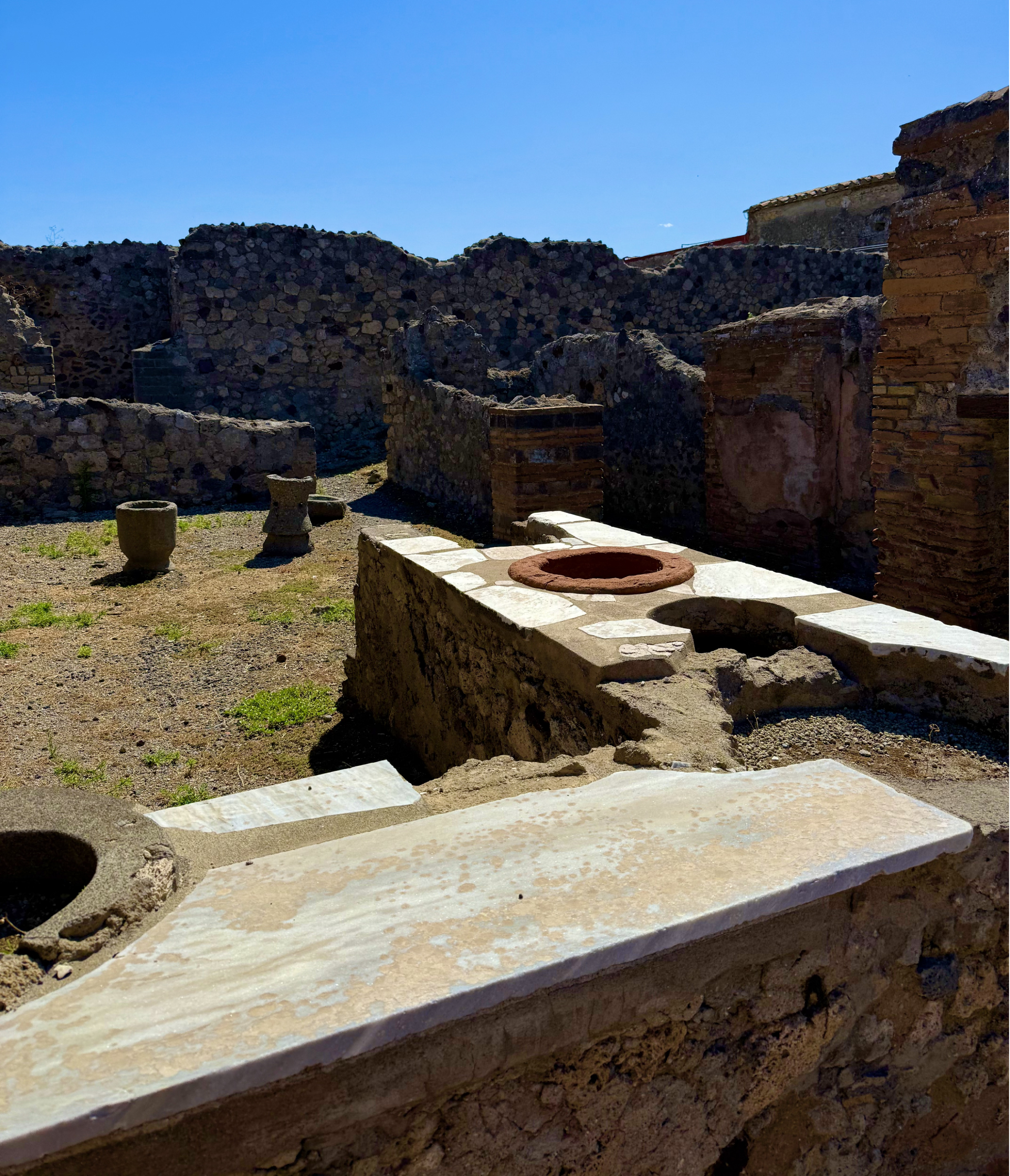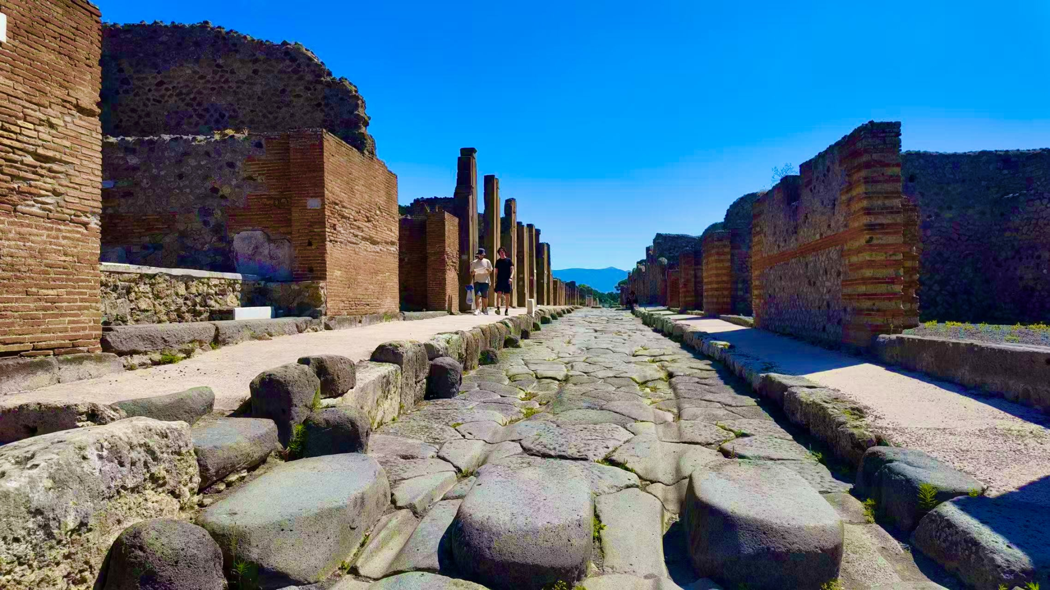 被维苏威火山喷发定格的庞贝古城,如同一座天然的时光胶囊,将公元79年的古罗马市井风貌完整留存。穿行在石板铺就的街道上,斑驳的壁画仍可见商旅往来的热闹,公共浴场的陶管水道、储水取水设施、市集的交易柜台,每一处遗迹都在诉说着昔日的生活细节。在老师的讲解中,那些被火山灰掩埋却未褪色的建筑布局、生活器具与社交场景逐渐鲜活—从贵族宅邸的庭院设计到平民居所的实用陈设,庞贝古城以静默的姿态,为大家展开了一幅古罗马人真实生动的生活长卷,让两千年前的文明气息触手可及。