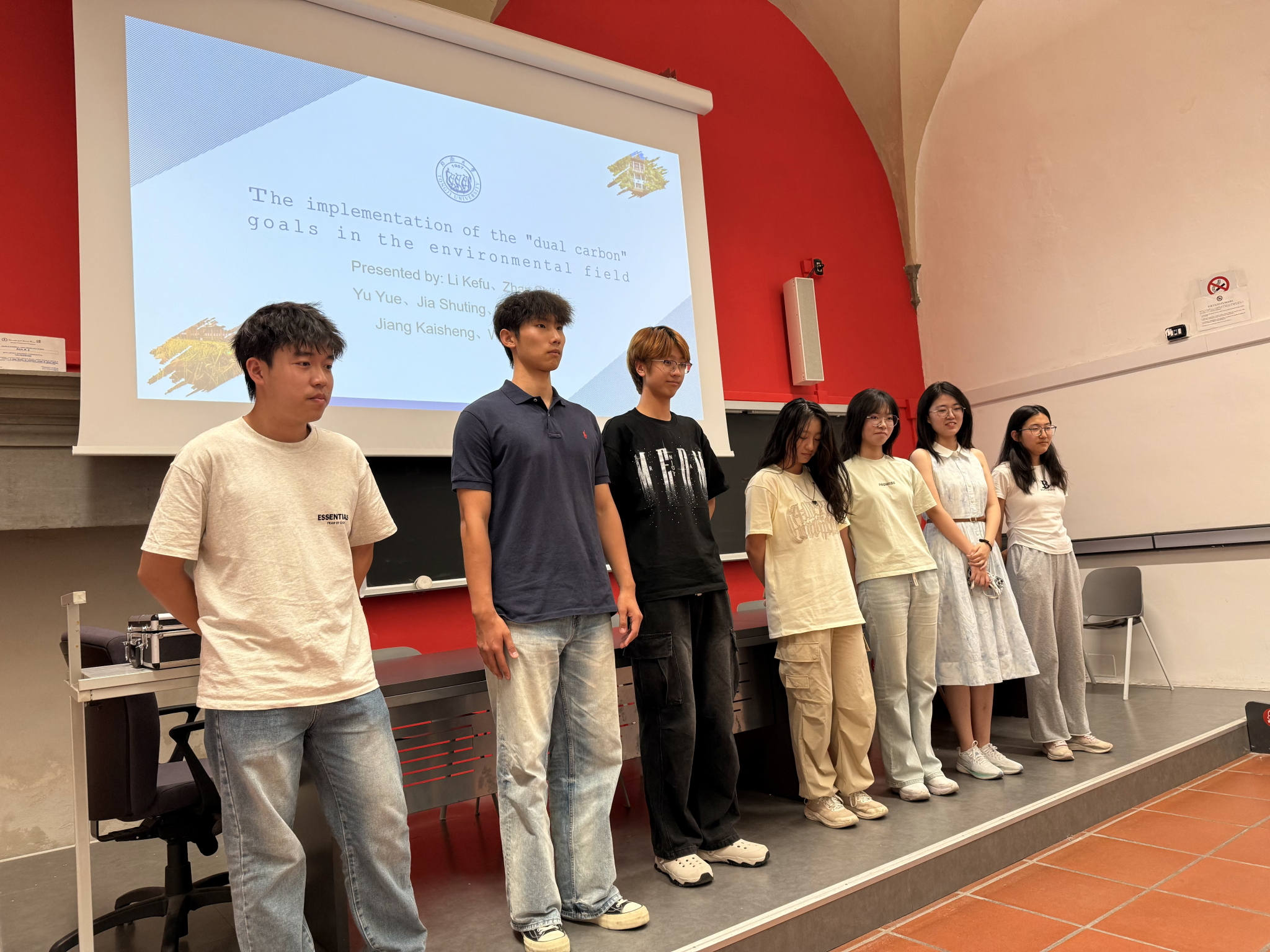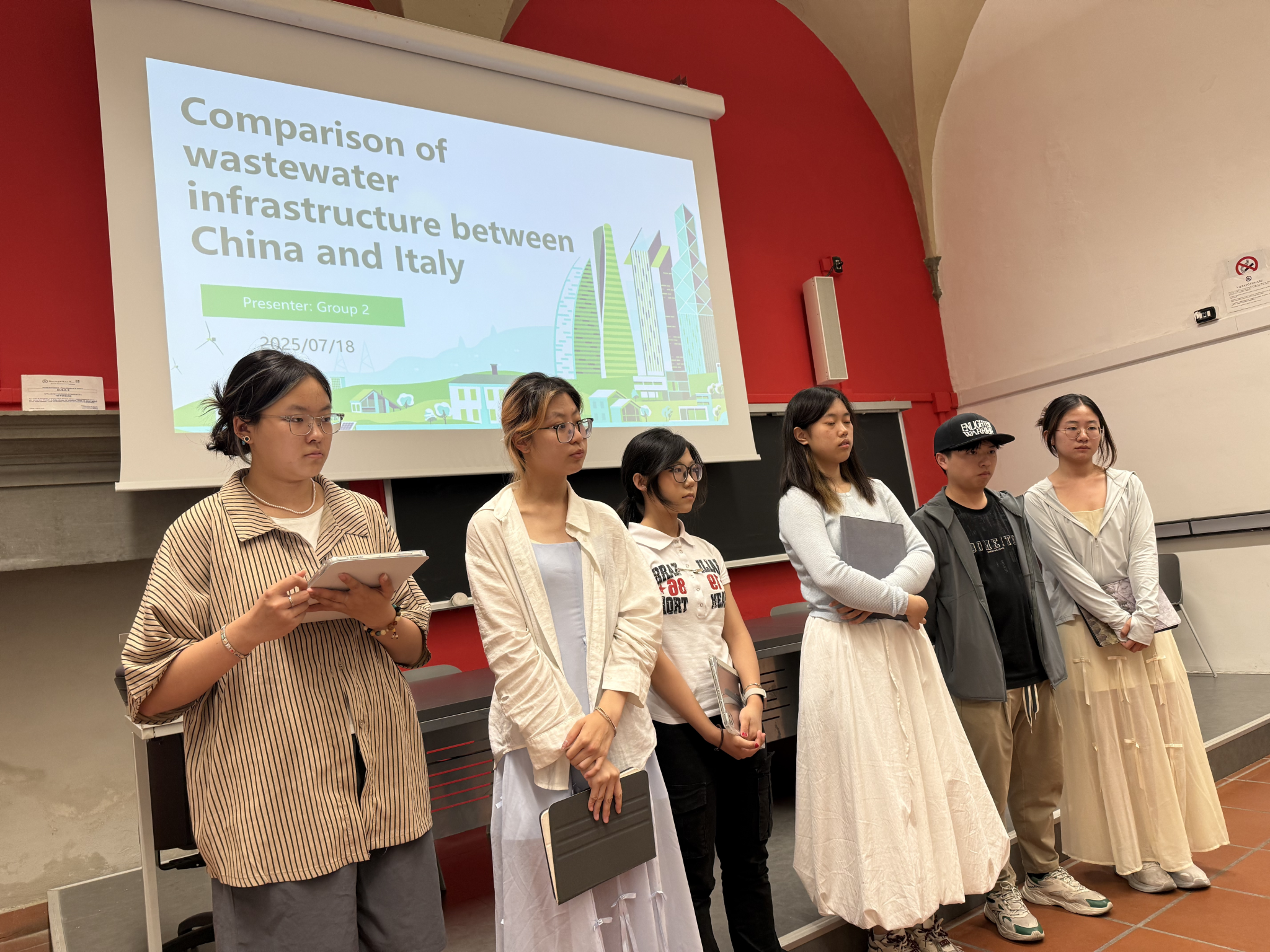在启程前,老师们根据行程安排以及实践参观内容设置了4个选题,分别为中意污水处理厂对比研究、中意城市水环境污染状况对比、城市与文明:中意古今供水与排水调研和“双碳”目标在环境领域的践行(中、欧异同)。同学们结合自己的兴趣进行了分组,通过在国内查阅相关资料,并与国外参观所获得的信息有机结合,在佛罗伦萨大学完成了精彩的选题汇报。老师们针对同学们的选题汇报进行了一一点评,并提出了宝贵建议。同学们一致认为,通过选题汇报,除了对自己小组负责的选题内容有了比较全面的了解,在聆听其他小组汇报的过程中对其他选题内容也有了深刻的理解。