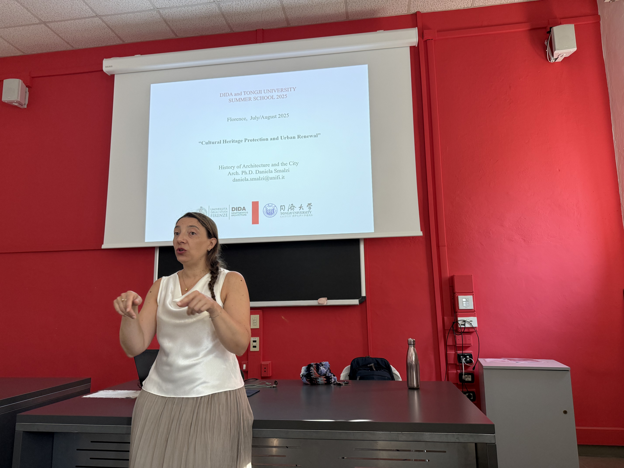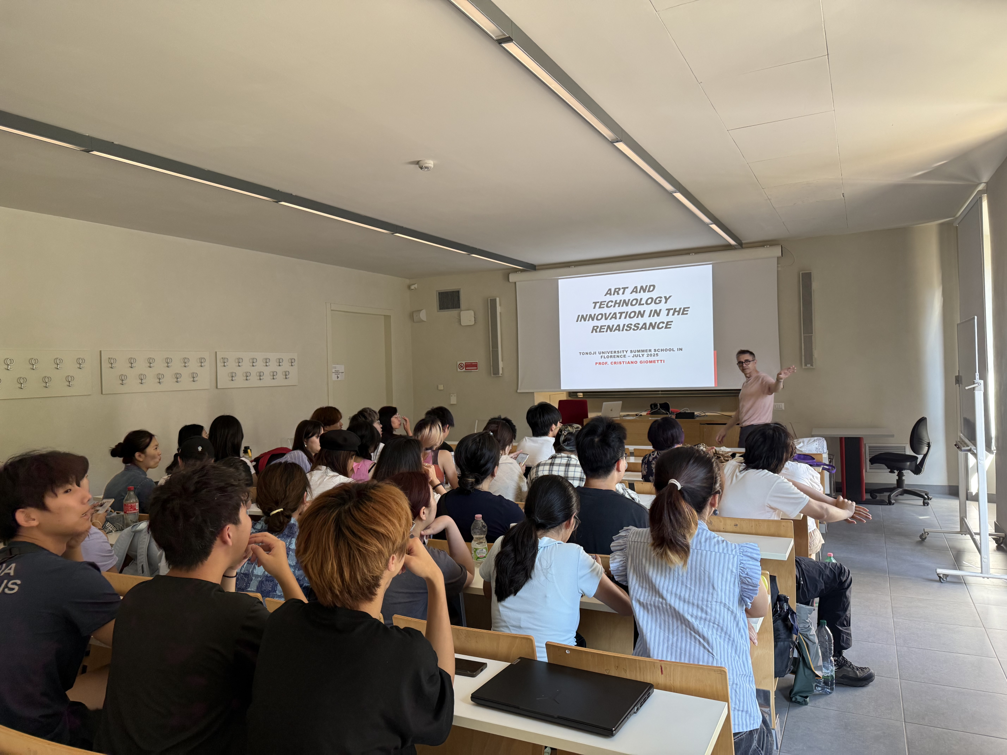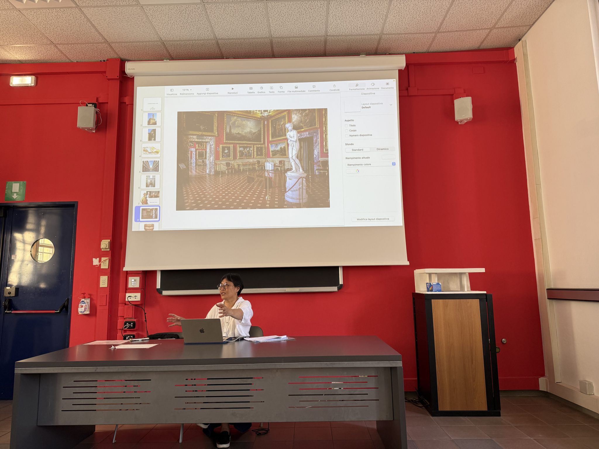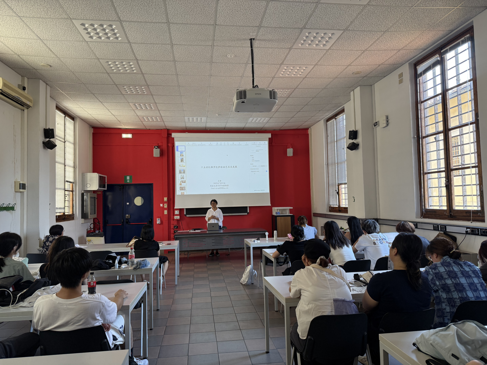 在佛罗伦萨大学校园里,Cristiano Giometti教授、Qiong Wang博士以及Daniela Smalzi教授给师生们进行了授课,带来了一场跨学科的知识盛宴。Cristiano Giometti教授以“Art and Technology Innovation in Renaissance”开启了课程序幕,他生动阐释了美第奇家族如何将艺术与科技完美融合,其深入浅出的讲解如同一把金钥匙,为同学们打开了理解那个伟大时代的智慧之门。Qiong Wang博士以“Uffizi Gallery and its collections”为题,对乌菲兹美术馆中的重要藏品以及米开朗基罗、波提切利、达芬奇等巨匠对文艺复兴的贡献进行了重点讲解,使师生们深刻感受着人文主义的光辉。建筑保护专家Daniela Smalzi博士则通过“Cultural Heritage protection and urban renewal”课程,从环境工程与城市规划的交叉视角,启发大家思考:如何运用现代科技手段,让这些承载着人类文明记忆的建筑瑰宝在当代城市肌理中重焕生机。