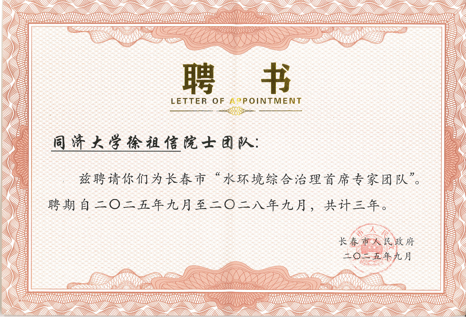 顾刚市长高度肯定徐祖信院士团队的专业精神与科技贡献,指出团队的研究成果为长春筑牢供水安全防线提供了重要科技支撑。会议现场,长春市常务副市长吴波代表市政府,向徐祖信院士团队正式颁发“长春市水环境综合治理首席专家团队”聘书,标志着双方在水环境综合治理领域的深度合作正式落地。