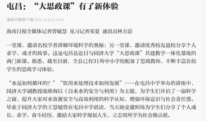 同济大学始终秉持“与祖国同行、以科教济世”的优良传统,积极推动优质教育资源下沉基层。此次与屯昌县共建“大思政课”教学一体化基地,是学校拓展思政教育外延、服务地方基础教育发展的又一重要举措。通过高校与中学的深度联动,不仅丰富了思政课的形态与内容,也为屯昌学子搭建了通往更广阔天地的桥梁。