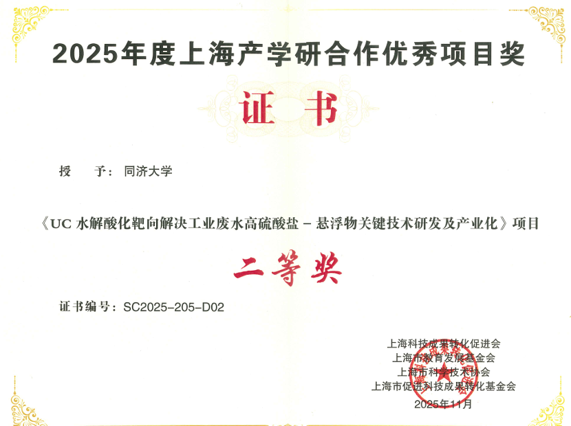 2025年12月26日,第十七届“上海产学研合作优秀项目奖”揭晓并颁奖。同济大学环境科学与工程学院谢丽教授团队参与完成的《UC水解酸化靶向解决工业废水高硫酸盐-悬浮物关键技术研发及产业化》项目荣获二等奖。该项目由高校与企业协同攻关,核心技术针对性解决工业废水处理领域高硫酸盐、高悬浮物的行业痛点,实现了科研成果向产业应用的有效转化。