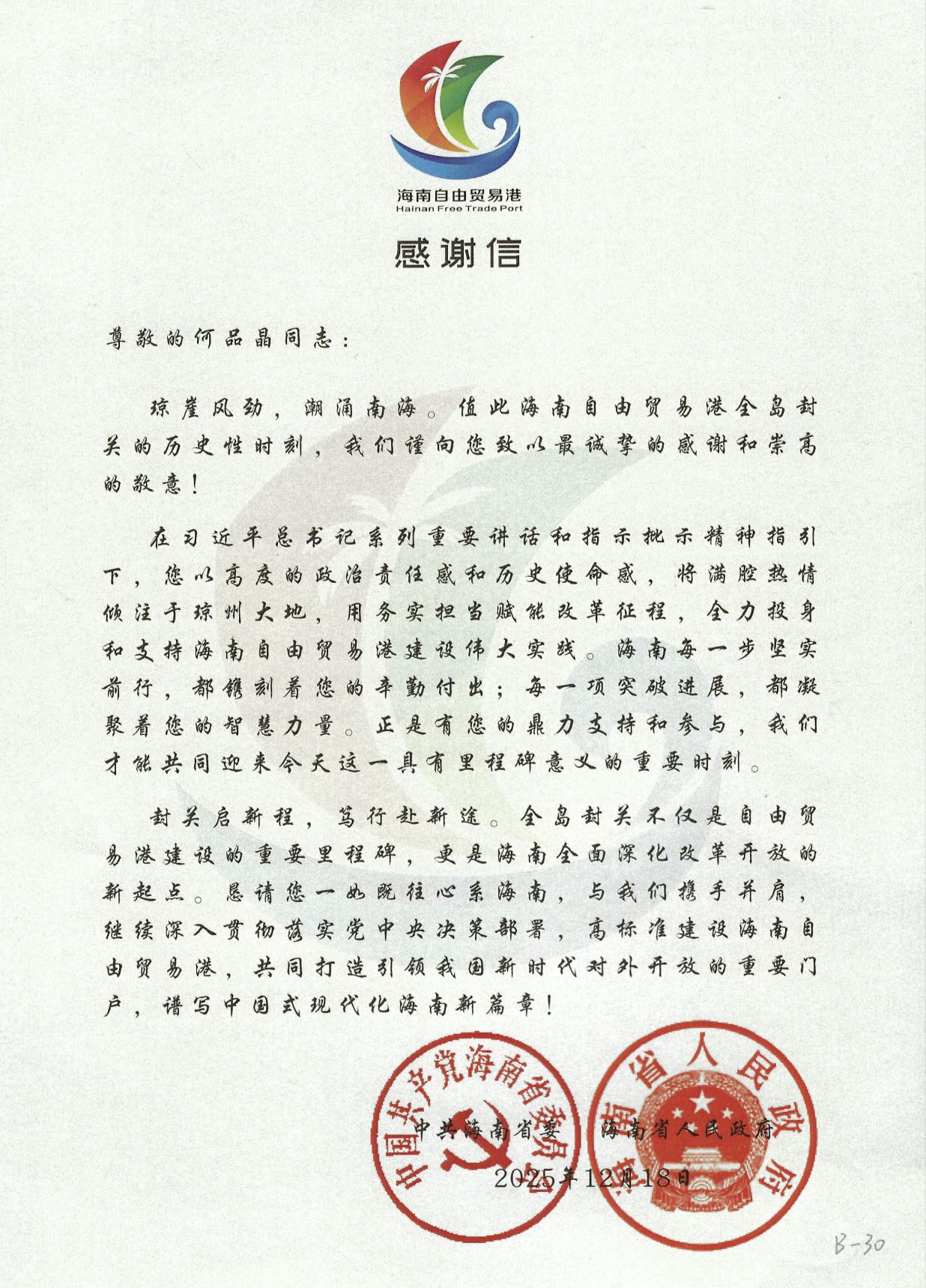 近日,我院何品晶教授收到海南省人民政府发来的《感谢信》。信中对何品晶教授长期以来投身和支持海南自由贸易港建设的辛勤付出和务实担当给予了高度肯定与诚挚感谢。