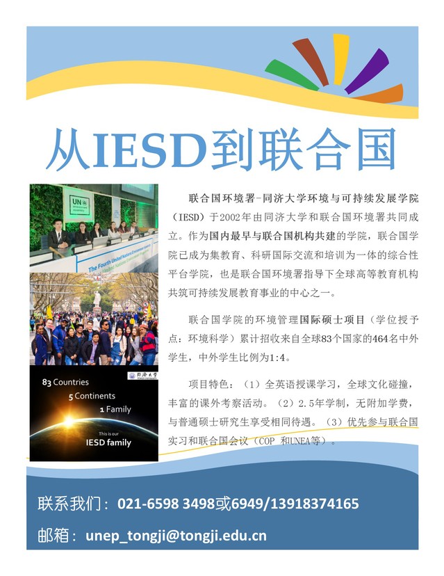 欢迎2019级参加硕士研究生复试的同学积极申报联合国学院IESD国际硕士项目,联系方式:65983498/65986949/13918374165,邮箱:unep_tongji@tongji.edu.cn。