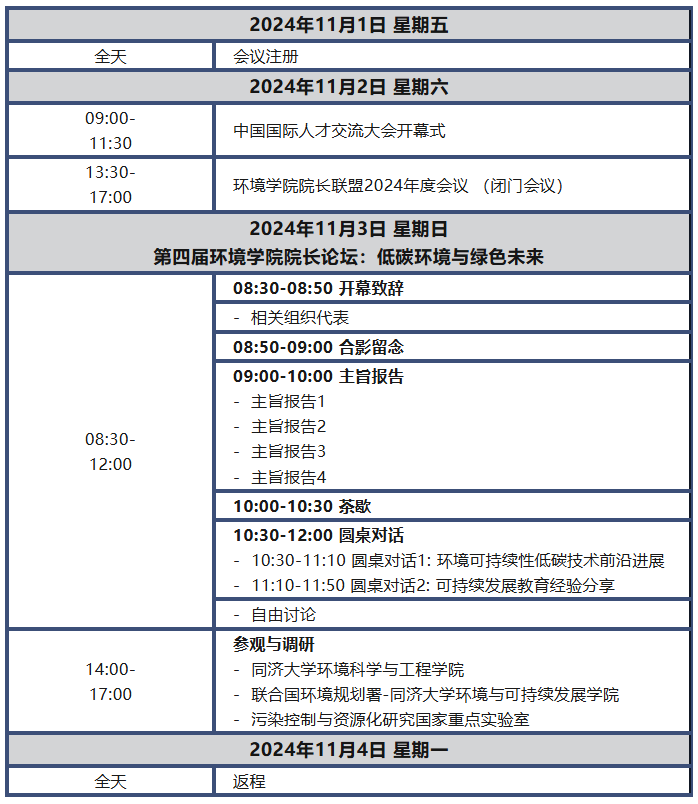 今年,应人力资源和社会保障部的邀请,第四届环境学院院长论坛将于2024年11月1日至4日在中国上海张江科学会堂与第22届中国国际人才交流大会(CIEP)同期举行。CIEP是一个全国性、国际化、综合性的国际技术创新人才交流平台,多年来已有来自40多个国家和地区的35000多名专家参加。