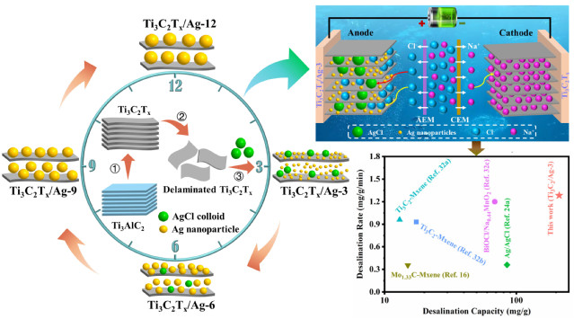 Ti3C2Tx/Ag除氯电极制备、电化学脱盐性能及机理图
