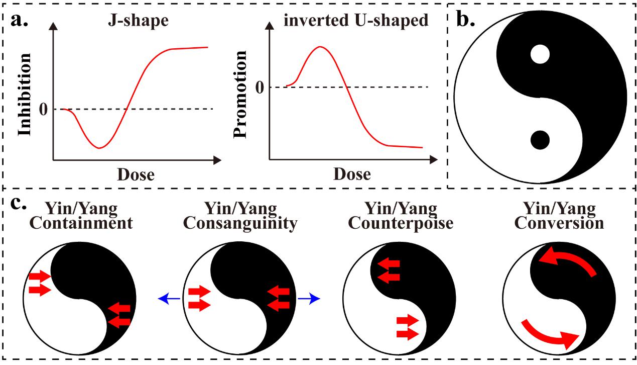 图a:典型Hormesis剂量效应曲线;图b:经典“阴阳图”;图c:“阴阳理论”核心概念—阴阳对立、阴阳互根、阴阳平衡、阴阳转化