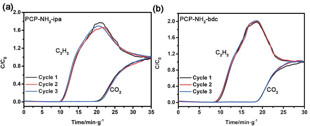 图2:两种PCP材料在室温常压条件下对C2H2和CO2等摩尔混合气体的穿透分离曲线(气体流速:4 mL / min)