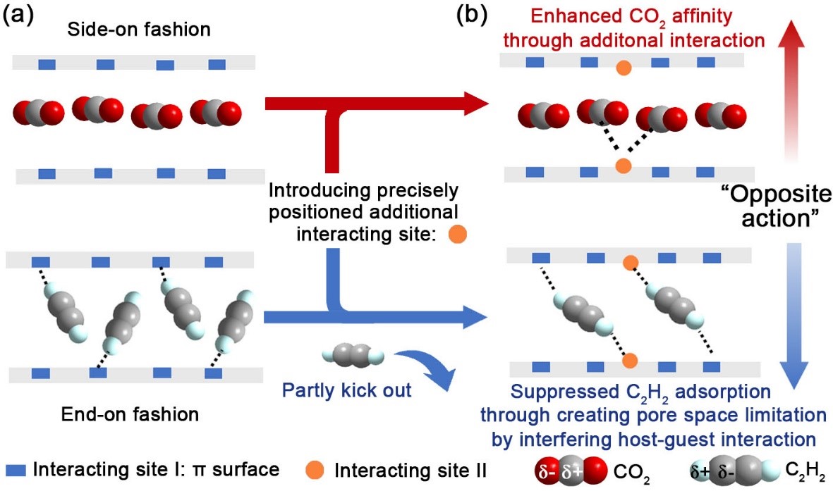 图1. “反作用”原理实现一维孔道中高CO2 / C2H2选择性吸附