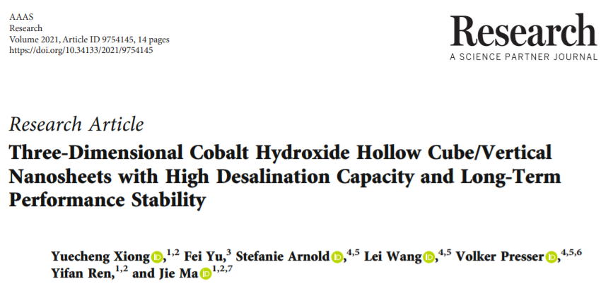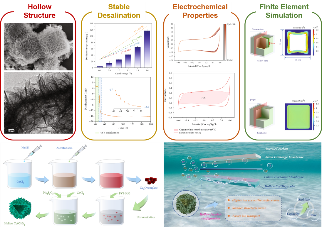 近日,同济大学环境科学与工程学院马杰教授团队、上海海洋大学于飞副教授团队和德国萨尔大学Volker Presser教授团队合作。本研究中,通过温和的模板刻蚀法制备了一种具有空心结构的立方氢氧化钴法拉第材料,充分挖掘和解析空心结构材料在脱盐中的潜力,证明材料的微观结构调控是实现高性能脱盐的一个有效策略。