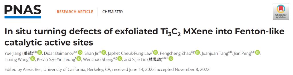 近日,国际权威刊物《美国科学院院刊》(Proceedings of the National Academy of Sciences of the United States of America,PNAS)在线发表了我院林思劼教授团队的研究论文“In situ turning defects of exfoliated Ti3C2 MXene into Fenton-like catalytic active sites”。林思劼教授为该论文的唯一通讯作者,我院直博生姜越(现博士后)为唯一第一作者,该工作还得到香港浸会大学梁士贤教授团队、中科院高能物理研究所王黎明副研究员团队、同济大学盛闻超教授团队、中科院苏州纳米技术与纳米仿生研究所金山博士以及上海同步辐射光源BL14W1线站的大力支持。本研究得到了国家自然科学基金委、国家重点研发计划和中央高校基本科研业务费专项资金资助。