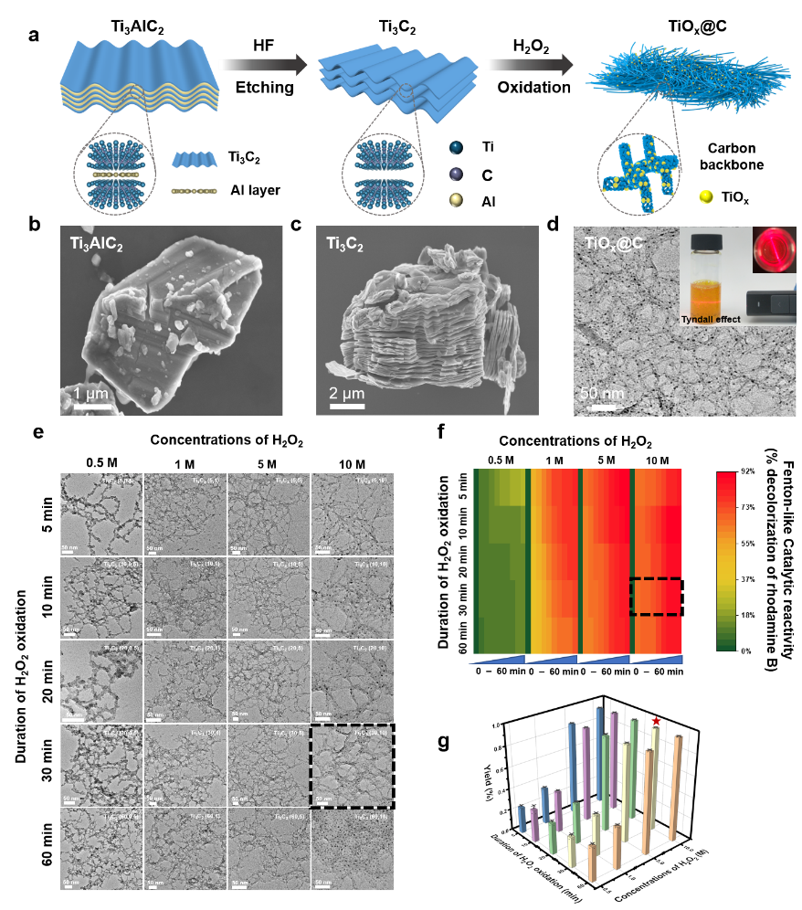 研究开发了一种新型的H2O2湿法氧化工艺。以Ti3C2 MXene为模板,利用其刻蚀过程中形成的本征Ti缺陷与H2O2发生强烈的氧化还原反应,原位生成无定形碳负载的高密度TiO1.47纳米团簇(TiO1.47@C)。通过改变H2O2的浓度和作用时间筛选最优的制备条件(10 mol·L−1 H2O2, 30 min),同时达到最大的样品产率(> 97%)。进一步通过DFT理论计算证明了Ti3C2 MXene表面的Ti缺陷是形成TiO1.47纳米团簇的关键反应活性位点,该纳米团簇具有丰富的表面缺陷且体系中存在Ti多价态共存现象(平均价态为+2.94)。基于X射线吸收精细结构谱(EXAFS)的成键变化分析得出,合成过程中H2O2原位氧化所导致的Ti-C-Ti键的断裂和Ti-O键的形成是该纳米团簇原位合成的关键。通过Ti元素的价态变化高效活化H2O2实现了多种典型新污染物(如阿特拉津、四环素、对硝基苯酚等)的高效降解。