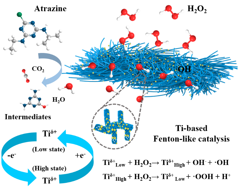 该研究提出了一种巧妙利用MXene本征表面缺陷和丰富过渡金属源原位构筑类芬顿纳米复合催化剂的新策略。文章以剥层Ti3C2 MXene作为模板,可控制备了一系列无定形碳负载的高密度TiO1.47纳米团簇(TiO1.47@C),揭示了钛基类芬顿催化剂活化H2O2降解阿特拉津的反应机制,实例论证了二维纳米材料“Safer-by-design”的实现路径,为内分泌干扰物和抗生素类新污染物的高效治理提供了新策略。