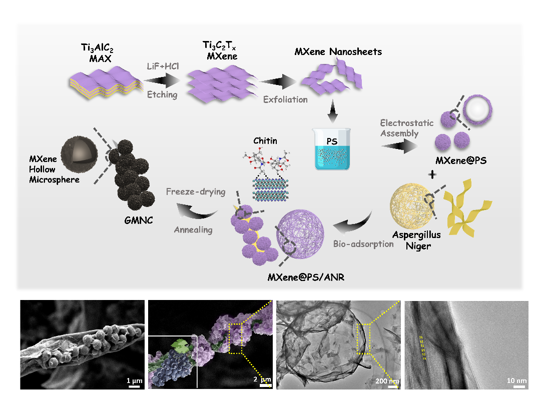 二维过渡金属碳/氮化物(MXenes)由于其优异的电子电导率(高达10000 S cm-1)、高比电容、亲水性表面和良好的机械稳定性,具有作为电化学离子捕获电极的潜力。然而,由范德华力和氢键作用,MXenes薄片倾向于聚集或重新堆叠,这在很大程度上延长了离子传递途径,减少了暴露的离子插入的有效活性位点。此外,由于大量的金属原子暴露在表面,亚稳定的MXenes倾向于在水环境中与H2O和O2反应,生成更稳定的金属氧化物,其电导率更低,不利于离子捕获。马杰教授团队利用微观形貌和异质结构构建的双重策略,合成了由真菌衍生的氮掺杂碳纳米带包裹的Ti3C2 MXene空心微球(GMNC),其呈现出独特的三维类葡萄串结构。三维葡萄串状异质结构的构建呈现双重协同效应,不仅增加了反应表面积,调节了电子分布,促进了整个动力学过程(包括离子和电子的传递),而且3D中空结构设计减少了重复Na+ (de)插入时特定点的应力集中从而增强了MXene的结构稳定性。结果表明,GMNC的脱盐能力和循环稳定性均有显著提升。三维类葡萄串异质结构的合理设计为MXene在电化学领域的高效应用提供了重要的见解。