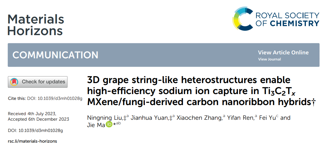 近日,国际权威刊物《材料视野》(Materials Horizons)在线发表了我院马杰教授团队的研究论文“3D Grape String-like Heterostructure Enable High-Efficiency Sodium Ion Capture in Ti3C2Tx MXene /Fungi-Derived Carbon Nanoribbons Hybrids”,马杰教授为该论文的唯一通讯作者,我院博士生刘宁宁、袁建华为共同第一作者,本研究得到了国家自然科学基金委和中央高校基本科研业务费专项资金资助。