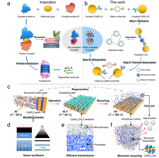 RHCS其独特的双层结构通过氢键和离子配位协同稳定,可在温和条件下自组装成超亲水材料。RHCS 通过动态氢键网络实现高效界面水调控,显著降低蒸发能耗,并具备优异的循环稳定性。基于太阳能或余热驱动的可逆解离-重组过程,RHCS在海水淡化中展现出卓越的耐盐性和蒸发效率。配套开发的模块化蒸发装置实现了高效水-热协同管理,同时避免了传统技术的高能耗问题。该技术通过闭环材料再生和绿色工艺,为可持续水-能系统提供了创新解决方案。
