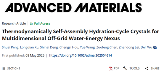 近日,我院吴德礼教授团队在可持续水处理与资源回收领域取得重要进展,成功开发了一种基于水合配位再生晶体的高效界面蒸发材料,相关成果以“Thermodynamically Self-Assembly Hydration-Cycle Crystals for Multidimensional Off-Grid Water-Energy Nexus”( 热力学自组装水合循环晶体驱动多维离网水能协同管理)为题发表于国际重要期刊《Advanced Materials》(影响因子27.3)。该研究为离网区域的海水淡化和废水脱盐领域提供了创新解决方案。