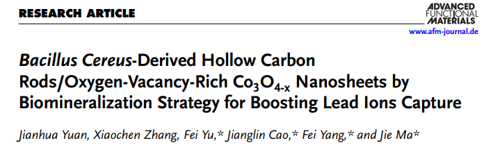 近日,我院马杰教授团队在《Advanced Founctional Materials》发表题为“Bacillus Cereus-derived Hollow Carbon Rods/Oxygen-Vacancy-Rich Co3O4-x Nanosheets by Biomineralization Strategy for Boosting Lead Ions Capture”的研究论文,在微生物合成金属氧化物电化学高效除铅方面取得新进展。