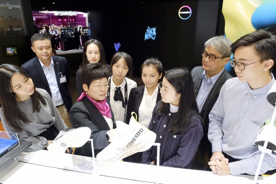 展会上,科思创中国区总裁雷焕丽女士与冠军队伍进行了交流,为同学们介绍了此次大展上科思创用到的高科技材料。雷女士讲到,‘If you want to be success, you need patience and persistence,’鼓舞同学们要有上进心、恒心和坚定的毅力。通过专家的介绍,同学们感受到了科思创材料在节能环保以及未来智能方面展现出的巨大潜力,有利于同学们思考如何运用这些可持续性材料给未来城市提供解决方案。