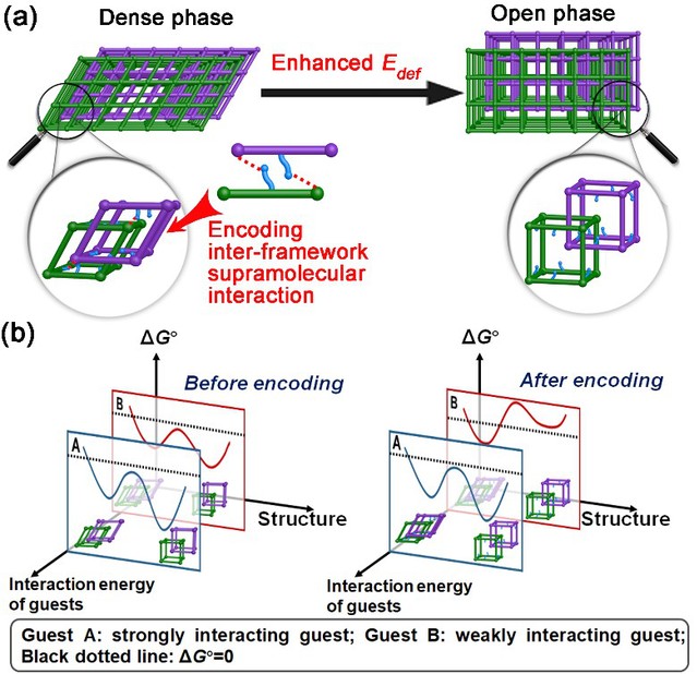 分子识别在许多生物、环境和化学过程中起着关键作用。近年来,受到具有高度结构自由度的各种生物分子(例如蛋白质)的精确分子识别功能的启发,表现出具有客体分子触发的结构转变特性的柔性多孔配位聚合物(Porous coordination polymers, PCPs),又称柔性金属框架化合物(Metal-organic frameworks,MOFs)引起了研究者的关注。然而,目前的研究仍集中在利用晶体衍射和客体分子吸附曲线分析对材料的结构柔性进行表征,而从能量角度出发对材料柔性设计的研究尚未见报道。