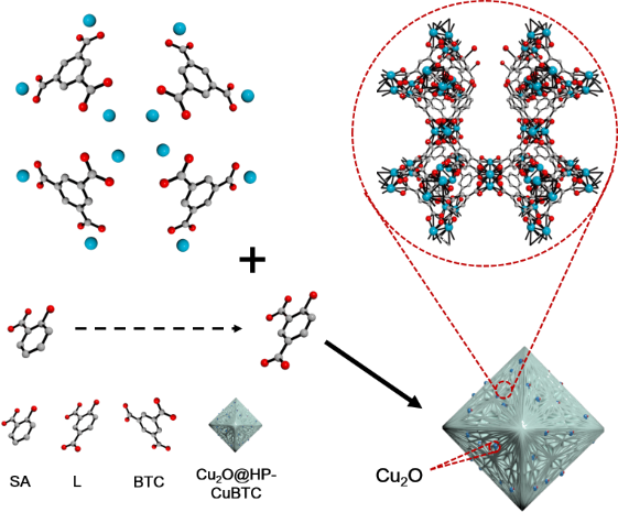 在金属框架化合物中分级孔隙度和充分暴露的活性位点是设计用于高效吸附特别是大分子的稳健框架的主要特征。同日课题组博士生封涛同学,在构建多级孔CuBTC(HKUST-1是一种金属有机骨架(MOF),由铜结点与它们之间的1,3,5-苯三甲酸组成)用作脱硫研究方面取得最新进展,在J. MATER. CHEM. A期刊上发表了题为“Feasible linker transformation strategy towards Cu2O nanoparticles immobilized hierarchical CuBTC creation for adsorption desulfurization”的研究论文,他们介绍了一个新的策略,称为配体转换法,可在CuBTC上同时构建介孔和Cu2O纳米颗粒。利用这种方法,构造了具有可调孔径分布的分级多孔结构的CuBTC,并保持了其结晶度和稳定性。此外,配体转换法同时也促进了Cu2O纳米颗粒在CuBTC的开放框架中的均匀分布。分级多孔结构使得大尺寸的芳香硫化合物容易扩散,而小粒径的氧化亚铜纳米颗粒高度分散,使得脱硫吸附性能得到了进一步的提高。这一新方法可以为设计更丰富的多自由度结构和进一步拓宽其应用范围提供新的思路。