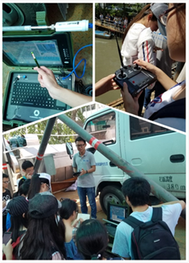 随后,同学们辗转四平科技公园,来到了调研的第二站。在这里,工作人员现场演示了水环境无人采样船的使用。据介绍,这艘SS30先进智能无人环境水体采样船(系校友张云飞所在云州智能科技有限公司在同济110周年校庆期间捐赠),主要是应用于水体采样和水质监测,携带有4个采样瓶,可一次采集四个点位的水样,既能通过遥控器手动控制,也可以通过电脑编程自动行驶,在实际应用中,具有操作简便、采样精准等诸多优点,极大地方便了水环境检测工作。工作人员还手把手地讲解无人船的控制方法,不少同学也接过遥控设备,亲身体验了一次无人船的操作控制。