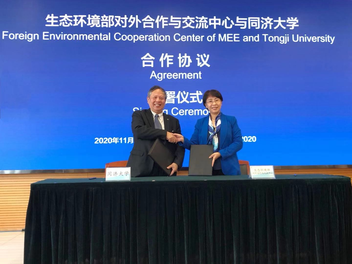 会上,我校和生态环境部对外合作与交流中心签署合作协议,双方将加强在生态环境领域的国际合作,内容包括推动绿色“一带一路”建设、促进区域生态环境治理、建立健全区域环境合作网络、开展区域可持续环境规划联合研究、提升生态环境保护能力建设,以及加强中非环境政策与技术合作。伍江与周国梅分别代表双方签署协议