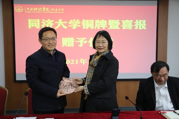 随后,在附中报告厅举办授牌暨学术报告会,江科附中高二年级零班、竞赛班全体学生及部分教师参与。徐院士和戴院长分别向胡校长赠送同济大学纪念铜牌和本科生招生及奖学金评选喜报,在场的附中师生备受鼓舞。