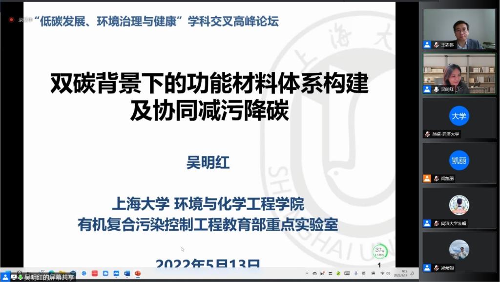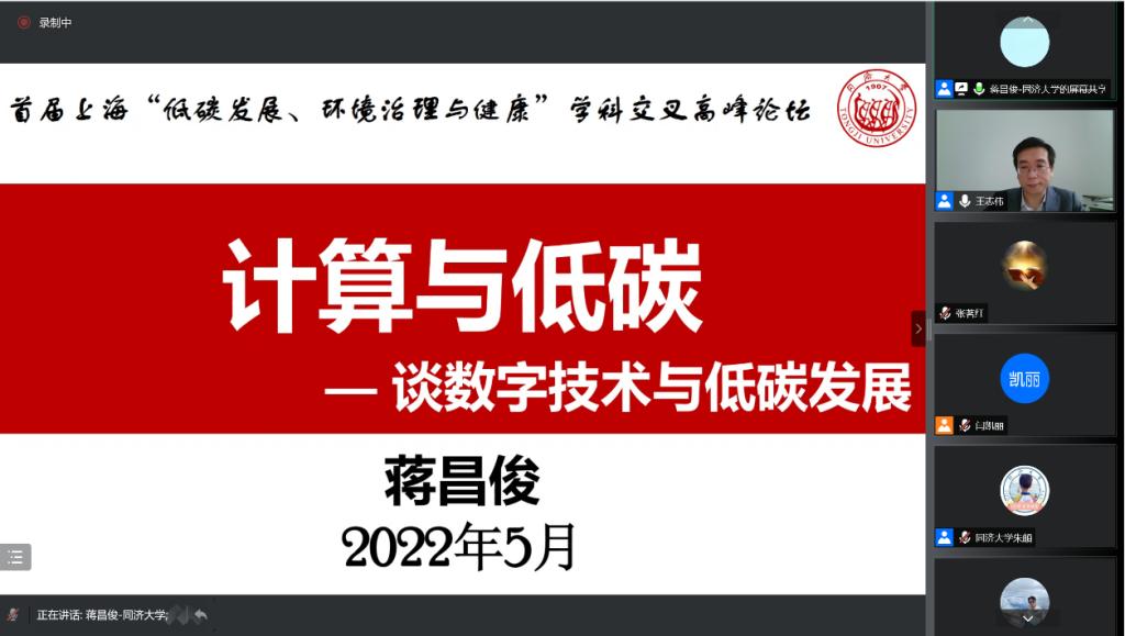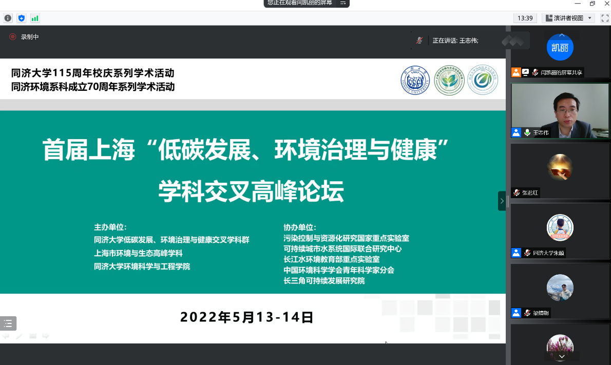 2022年5月13日-14日,在同济大学建校115周年及同济大学环境系科成立70周年之际,由同济大学低碳发展、环境治理与健康交叉学科群、上海市环境与生态IV类高峰学科与同济大学环境科学与工程学院共同主办的首届上海“低碳发展、环境治理与健康”学科交叉高峰论坛在线上顺利召开。本次高峰论坛设置了主会场、“气候变化与碳中和”“循环经济与可持续水系统”“新污染物与环境健康”三个专场及“高峰学科与交叉创新”优秀青年论坛,共邀请了28位跨学科的院士、专家与优秀学者做特邀报告,其中中国工程院院士2人、国家杰青/长江7人、四青人才12人,共同研讨“低碳发展、环境治理与健康”学科交叉融合与创新发展。