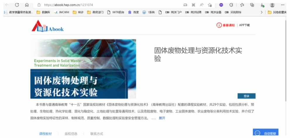 受教育部高等学校环境科学与工程教学指导委员会和高等教育出版社委托,团队分别在2016~2018年(第11~13届)的“全国高校环境类课程教学系列报告会”上,组织和主持了“固体废物处理与处置(实验)课程教学与资源建设”分会场,开展了课程实验教学的专题交流讨论,并启动组织编写实验教材。2019年6月组织承办了固体废物处理与资源化实验教材编写研讨会;2021年4月完成教材初稿提交高等教育出版社审查;2022年6月正式出版。