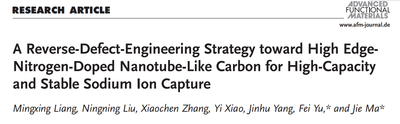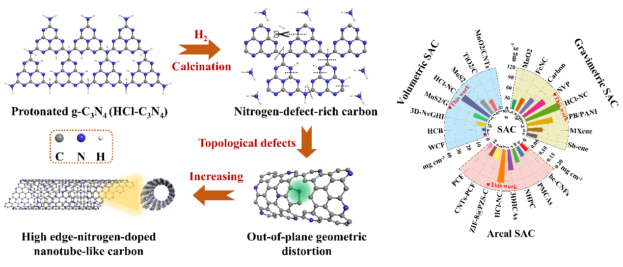 非金属元素掺杂是增加活性位点,提高碳材料电化学性能的重要途径之一。传统碳材料掺氮方法是将含有氮源的前驱体在高温下热解,煅烧温度高,石墨化程度高,但掺氮量低;煅烧温度低,掺氮量高,但石墨化程度低。因此,采用从零到多的掺氮策略来权衡本征导电性和活性位点,充满挑战,难以逾越。近日,同济大学环境科学与工程学院马杰教授团队采用有别于传统的由零到多的掺氮策略,选取具有sp2杂化碳原子和氮原子堆积结构的石墨相氮化碳作为前驱体,基于逆向缺陷工程策略(Reverse-Defect-Engineering Strategy),在保持优异导电性的同时实现碳材料的高掺氮量。利用氢气还原耦合梯度升温方法,增加拓扑缺陷,在无金属催化剂添加的情况下,实现类管状形貌的合成;利用分子间氢键作用调控前驱体,实现吡咯氮/吡啶氮比例的有效调控。制备得到的高边缘型氮掺杂的类管状碳电极展现了高容量、快速率、低能耗、优异循环稳定性的盐离子去除性能,为解决工业循环冷却水脱盐难题的CDI碳基电极提供重要的设计思路。这一工作发表于Wiley旗下高水平国际期刊Advanced Functional Materials,马杰教授课题组博士生梁明星为论文第一作者,马杰教授为通讯作者,同济大学为第一单位。