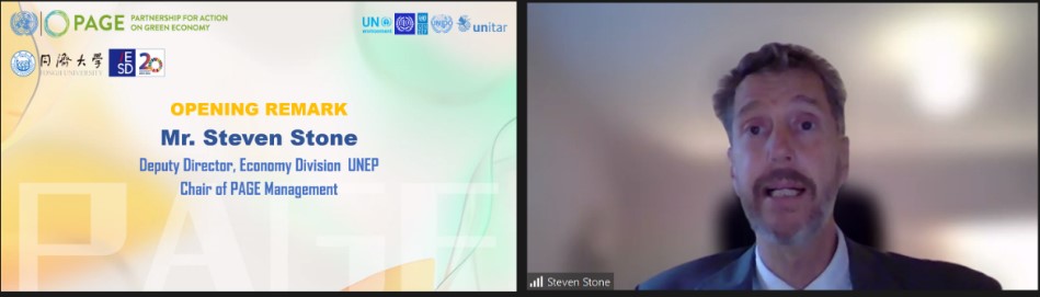 Steven Stone先生从自身出发,分享了在可持续发展事业尤其是绿色经济方面的工作经验,作为PAGE的核心人物,他对PAGE China取得的成就表示祝贺,并希望本次为期一周的研讨会能够将各方聚集在一起,为中国绿色经济转型的势头注入新的动力。