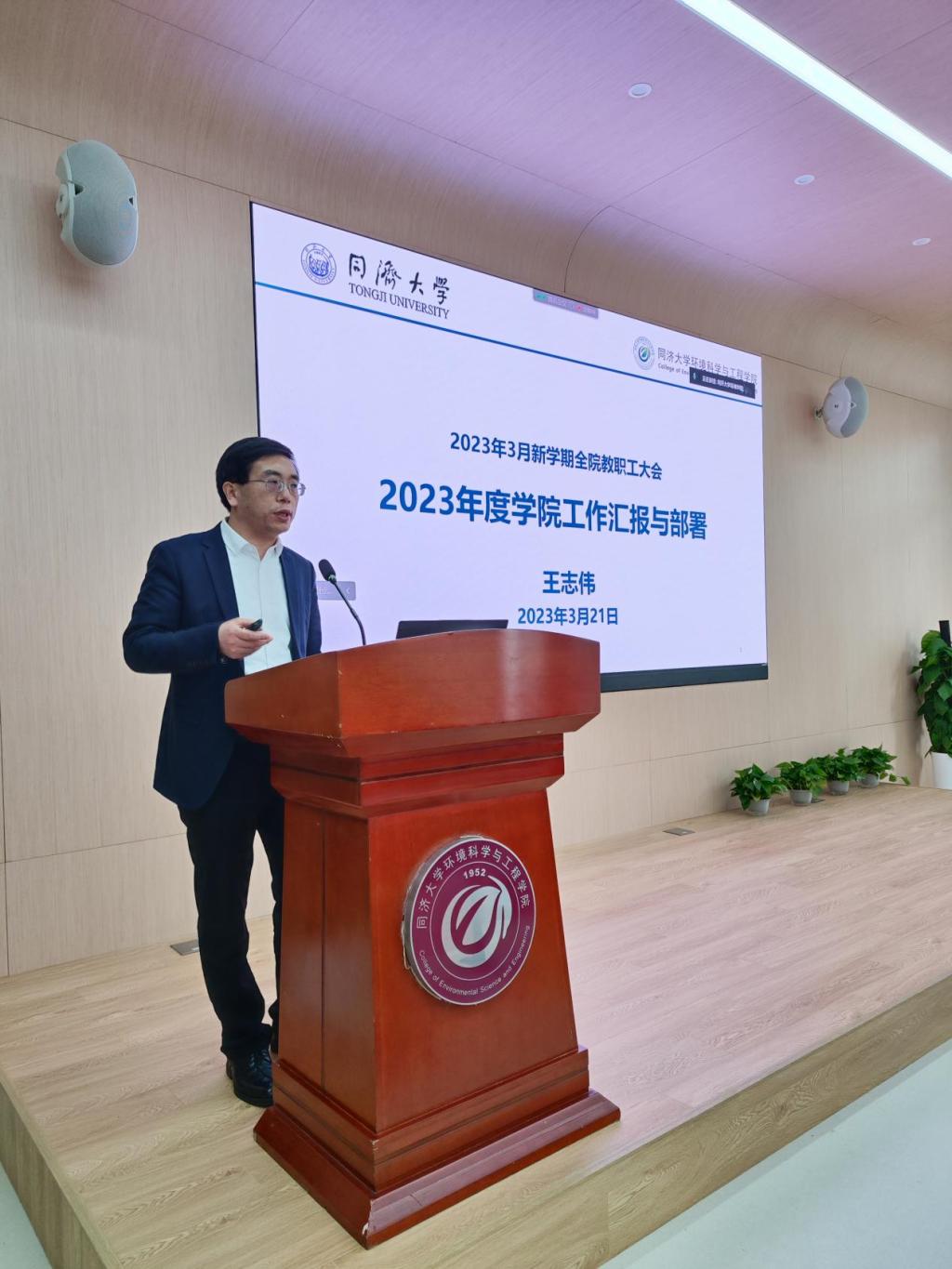 王志伟院长以《2023年度学院工作汇报和部署》为题,传达了学校开学工作会议精神,分析了学院发展面临的形势与挑战,明确了学院2023年工作思路,重点介绍了2023年环境学院的四项重点工作:一是落实立德树人专项巡视整改,实施环境学院人才培养质量提升三年行动计划;二是高质量开展学科建设,推进环境健康、碳中和管理等学科方向与团队建设;三是扎实推进国家级平台优化重组工作,做好重大科研项目、重大科研奖励申报;四是打造重大国际会议、重大国际报告品牌,高质量推进可持续发展国际合作。王志伟院长进一步从学院党建、人才培养、学科建设、科学研究、队伍建设、国际合作、管理服务七个方面对全年工作进行了详细部署。要求学院全体教职工团结一致、凝心聚力,扎实推进学院各项工作。最后,王院长还提出了学院今年要为广大师生办的涉及青年教师发展、信息化和综合事务管理、办公空间改善、院史文化展示等七大实事。