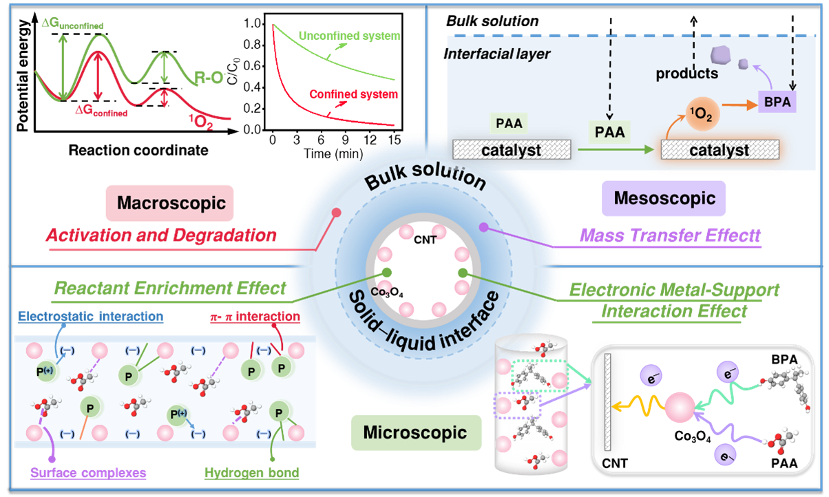 研究进一步构建了新型传质-化学动力学模型,结合DFT理论计算表明,碳纳米管表面和内部离域π电子改变电子的传输特性,限域效应导致体系价电子结构的改变,引起量子突变,降低了整体的限域反应能级,从而改变了催化反应路径。同时,污染物分子和活性物质在碳纳米管限域通道内快速传输,降低了分子在溶液中的无序扩散,有利于污染物分子和活性物质的富集,从热力学上促进氧化过程,缩短反应时间,最终实现了快速高效和高选择性的限域催化反应。该研究以污水低碳化处理的需求为导向,解决了传统非均相类芬顿氧化技术“效率低”、“选择性差”、“条件苛刻”等关键难题,有望推动新型非均相类芬顿氧化技术的发展,同时也为绿色水处理技术研究提供了新思路。