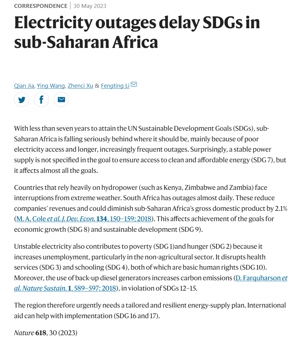 2023年5月30日,权威期刊《自然》发表李风亭教授团队短文《停电导致撒哈拉以南非洲地区SDG进程严重滞后》(Electricity outages delay SDGs in sub-Saharan Africa, Nature 2023; 618; 30),指出在2030年全球可持续发展目标(Sustainable Development Goals,SDGs)下,撒哈拉以南非洲地区由于饱受停电问题困扰,实现可持续发展目标的进程严重滞后。此外,可持续发展目标中没有对电力系统的稳定性提出要求,但是停电问题几乎对每一项子目标都产生了负面影响。