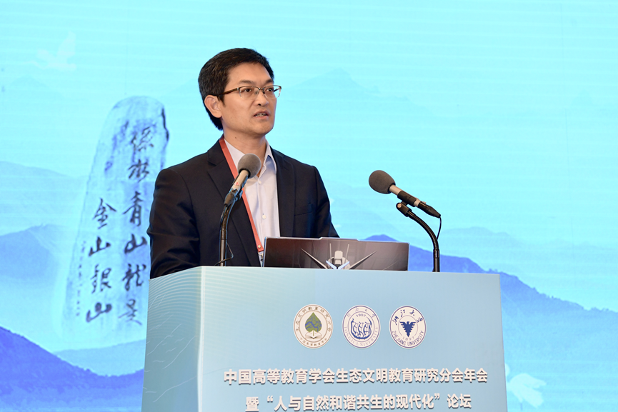 黄翔峰代表浙江大学致辞,他指出浙江大学在学科建设中深化环境、生态、资源、能源等生态文明相关优势学科的交叉融合,启动实施2030学科会聚研究计划之生态文明计划,组建跨学科研究团队,培育一批国内外领先的研究成果并初见成效。他还指出面向未来,浙江大学还将坚持以习近平生态文明思想为指导,主动对接国家重大战略需求,不断推广高质量绿色发展的理论与实践成果,支撑绿色低碳循环发展。