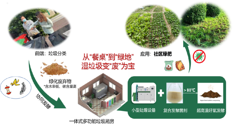 作品简介:针对社区垃圾分类点湿垃圾易腐败发臭、运输成本高的问题,本作品发明设计了一种将收集点湿垃圾原位快速降解的小型化超高温好氧发酵技术装备:合理利用湿垃圾的易腐组分生物降解速度快、产热量大的特点,通过构建自有菌剂与原位资源化装备相结合的社区小型化湿垃圾超高温好氧发酵系统,将湿垃圾转化为社区高品质绿化用土。项目成果在十个城市与农村社区进行了试点应用,取得良好的示范效果。