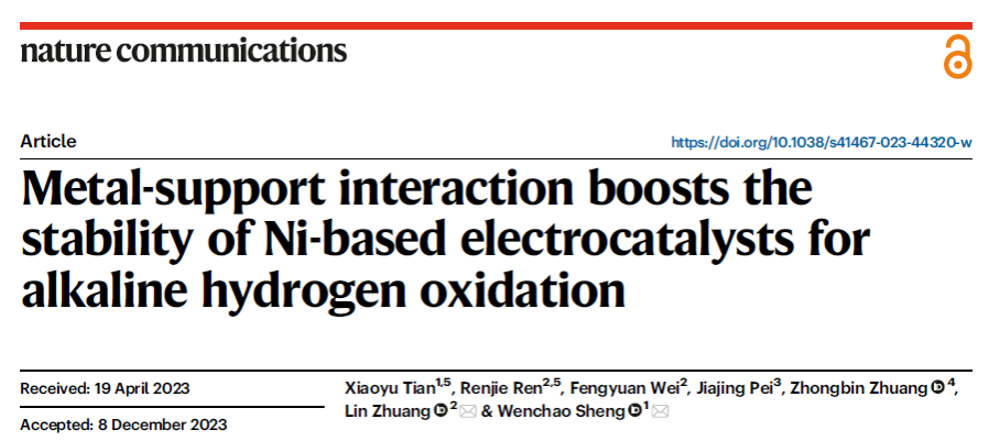 近日,国际权威刊物《自然通讯》(Nature Communications)在线发表了我院盛闻超教授团队的研究论文“Metal-support Interaction Boosts the Stability of Ni-based Electrocatalysts for Alkaline Hydrogen Oxidation”。同济大学为第一单位,盛闻超教授和武汉大学庄林教授为通讯作者,我院田晓宇博士生和武汉大学任仁捷博士生为共同第一作者。该工作还得到北京化工大学庄仲滨教授团队和中科院高能物理研究所裴加景博士的大力支持。本研究同样得到了国家自然科学基金委和中央高校基本科研业务费专项资金资助。