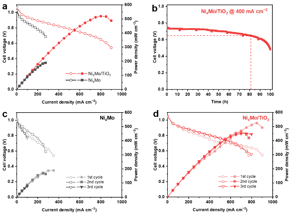 图2.(a)Ni4Mo和Ni4Mo/TiO2阳极AEMFC极化曲线和功率密度曲线图;(b)Ni4Mo/TiO2阳极AEMFC在400 mA cm−2电流密度的长期耐久性测试曲线;(c)Ni4Mo和(d)Ni4Mo/TiO2阳极AEMFC连续三次循环放电的极化曲线和功率密度曲线