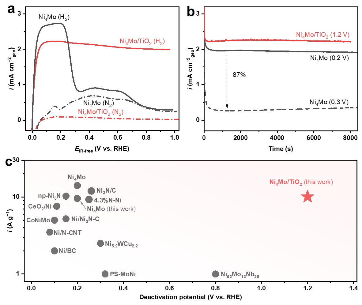 图1. Ni4Mo和Ni4Mo/TiO2在H2和N2饱和0.1 M NaOH中(a)CV曲线和(b)不同阳极过电位计时电流曲线;(c)镍基非贵金属碱性HOR电催化剂的失活电位和质量活性