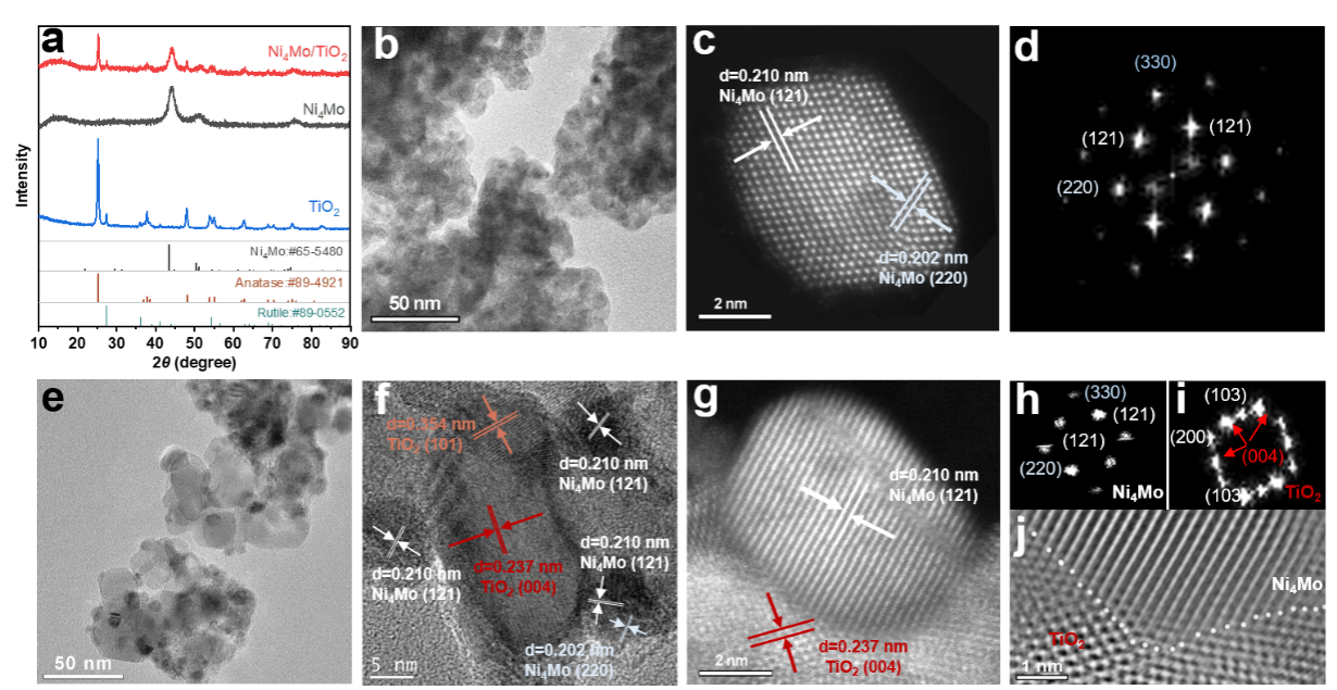 图3.(a)Ni4Mo、Ni4Mo/TiO2和TiO2的XRD图;Ni4Mo的(b)TEM图、(c)HAADF-STEM图以及(d)相应的FFT图;Ni4Mo/TiO2的(e)TEM图、(f)HR-TEM图、(g)HAADF-STEM图、(h和i)相应的FFT图以及(j)反向FFT图