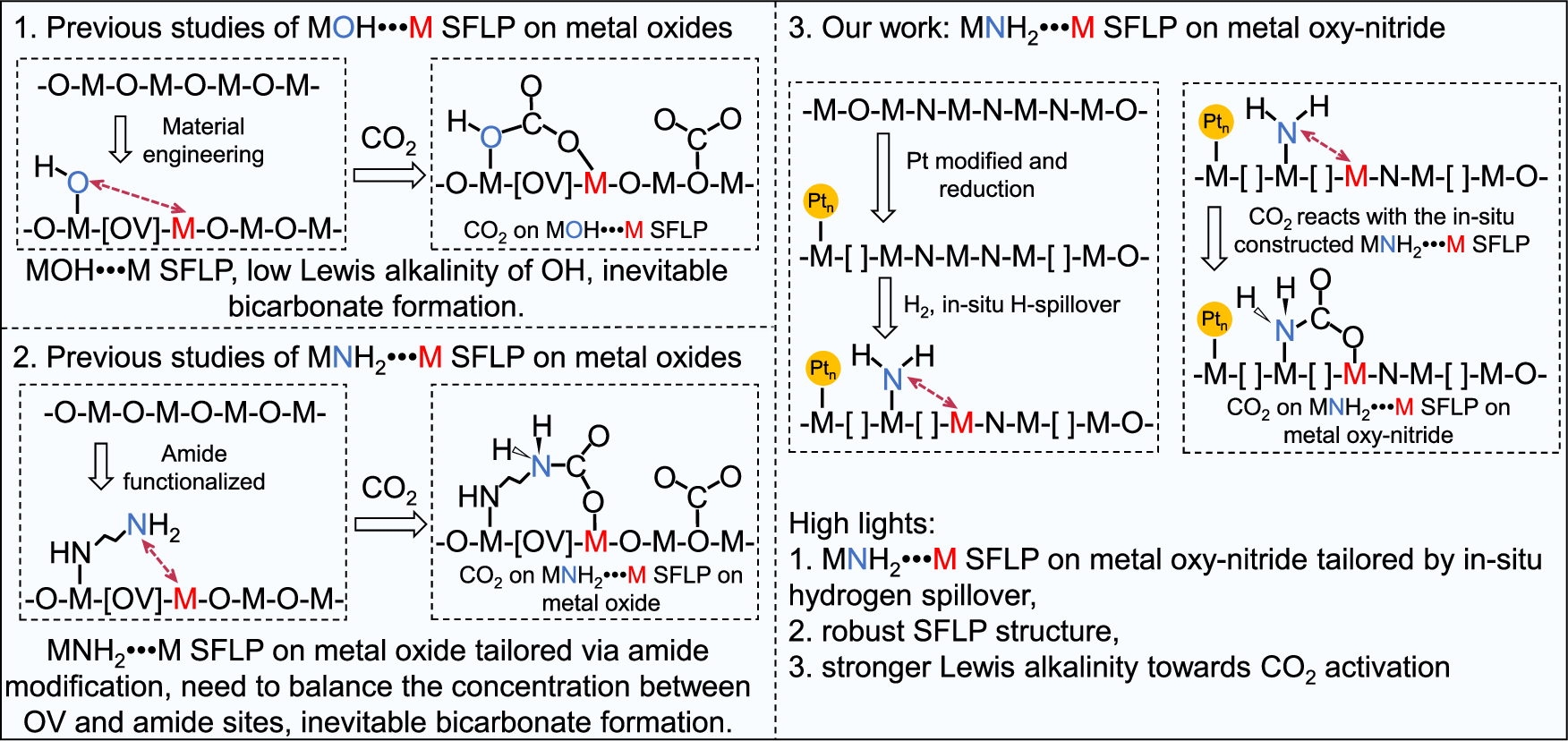 凌岚教授团队以氮化钛作为研究模板,深入探讨了氢溢流在氮化钛表面构建的一种胺类表面受阻Lewis酸碱对(MNH2•••M),以及其在二氧化碳还原中的作用。这一新型表面受阻Lewis酸碱对通过分离的Lewis酸碱中心活化二氧化碳至氨基甲酸酯中间体。本研究还构建了含表面受阻Lewis酸碱对的氮化钛模型,揭示了表面氨基和配位不饱和钛原子的协同系统如何高效活化和转化二氧化碳为一氧化碳。这一研究将表面受阻Lewis酸碱对的化学空间从传统的氧化物-氢氧化物结构拓展至金属氮化物-氮氧化物,为构建金属氮化物-氮氧化物基的新型表面受阻Lewis酸碱对催化剂提供了新的视角。